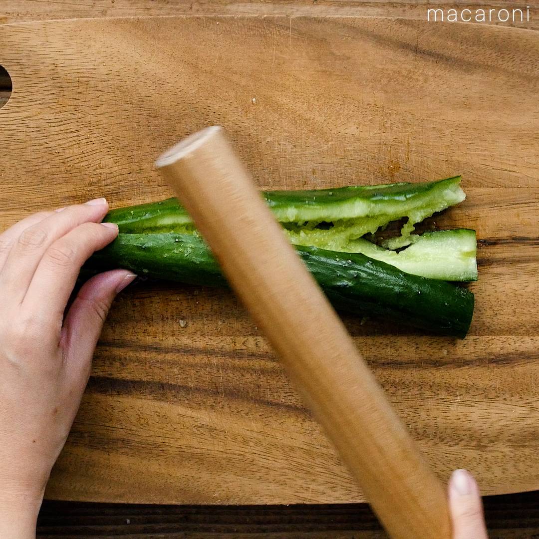 きゅうりは麺棒などで叩き、食べやすい大きさにします。