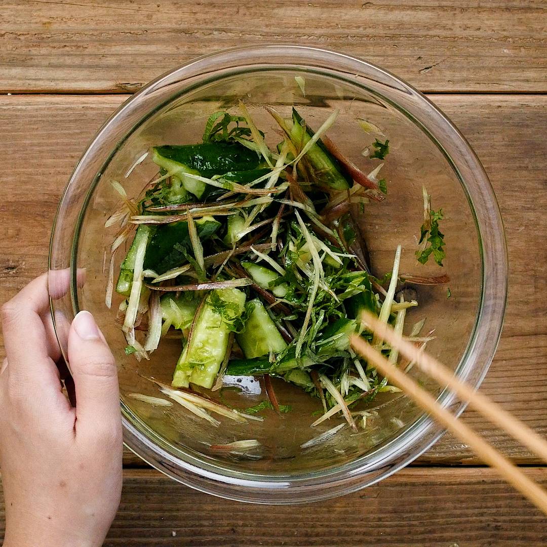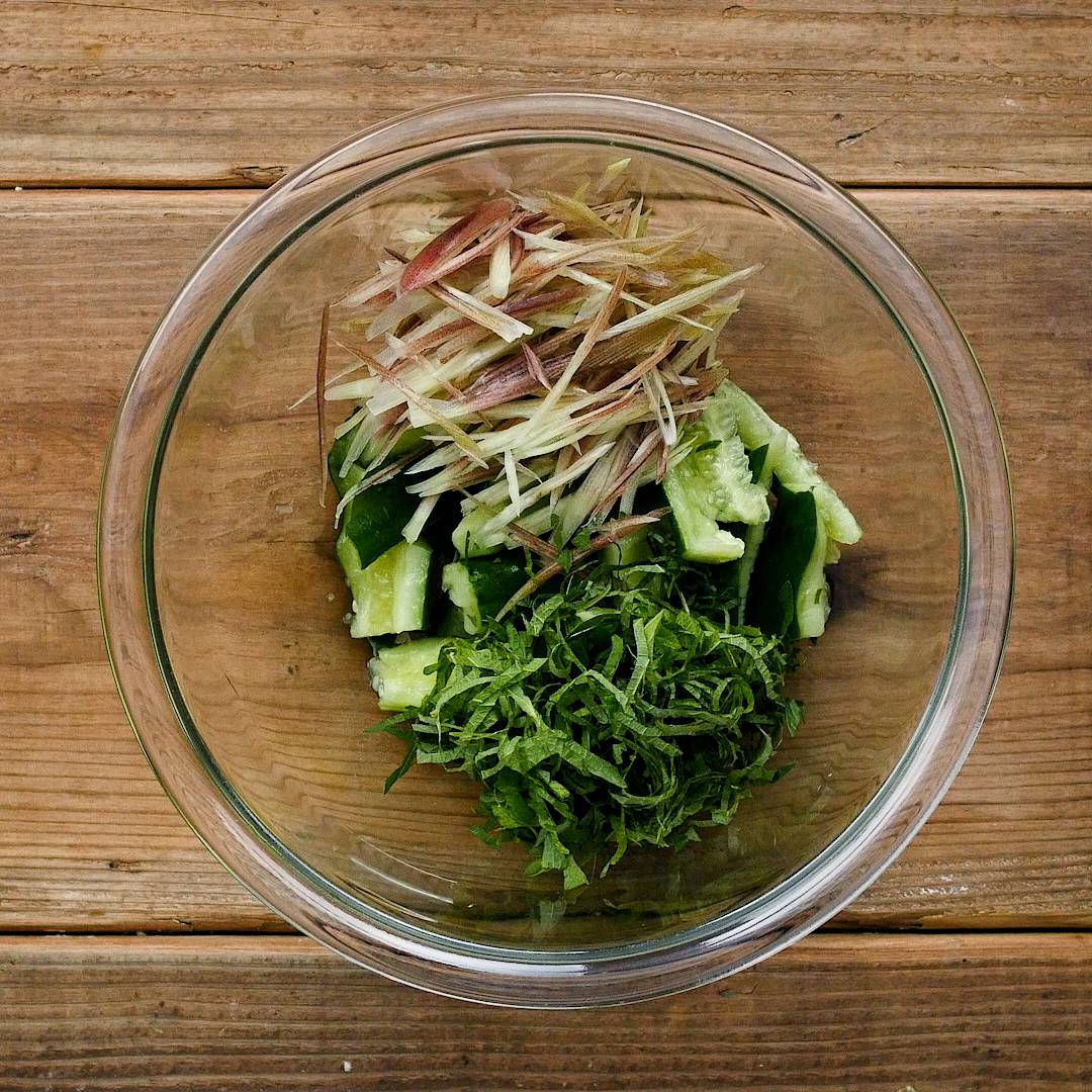 ボウルにきゅうり、みょうが、大葉を入れて全体を混ぜ合わせます。