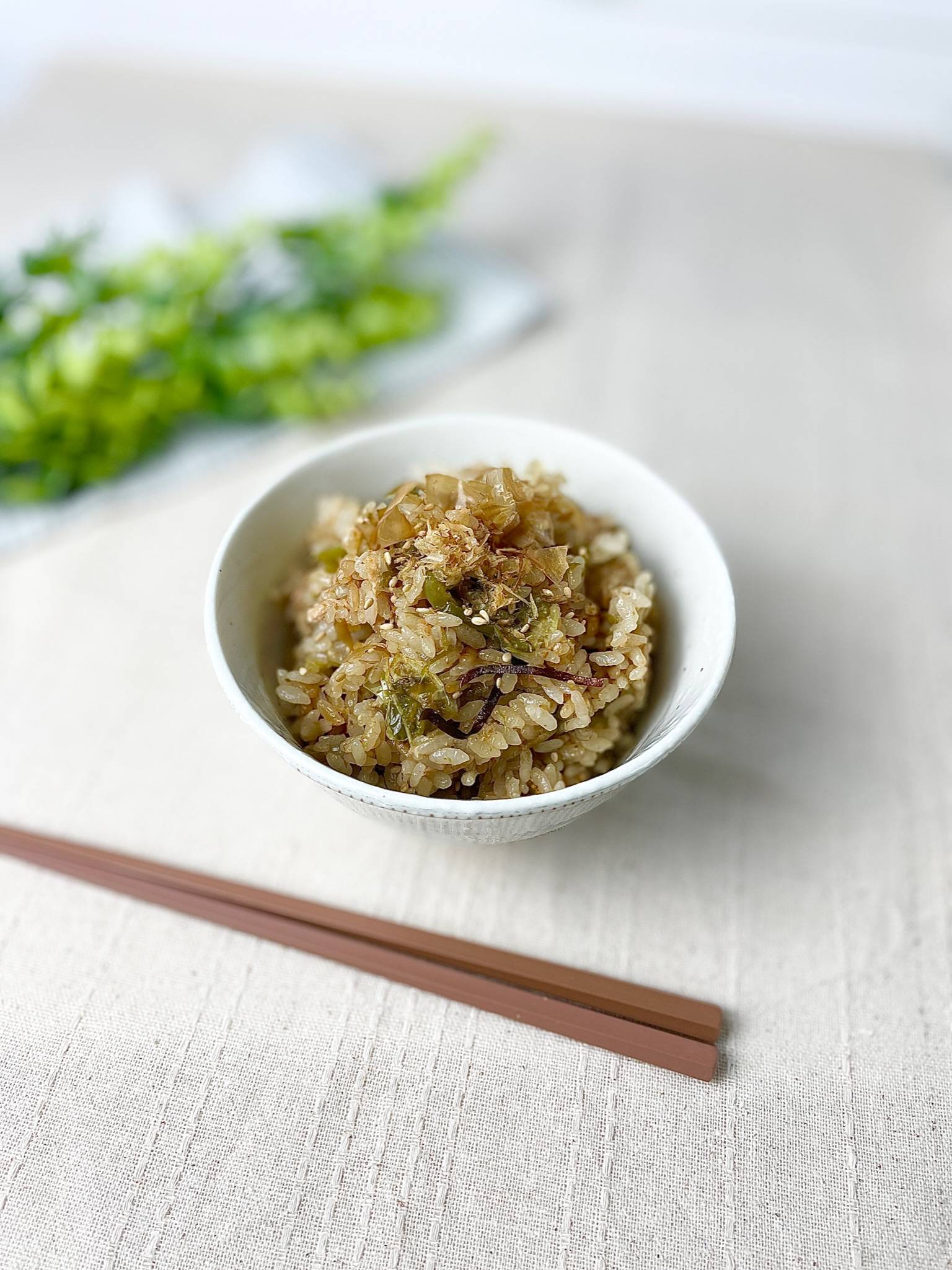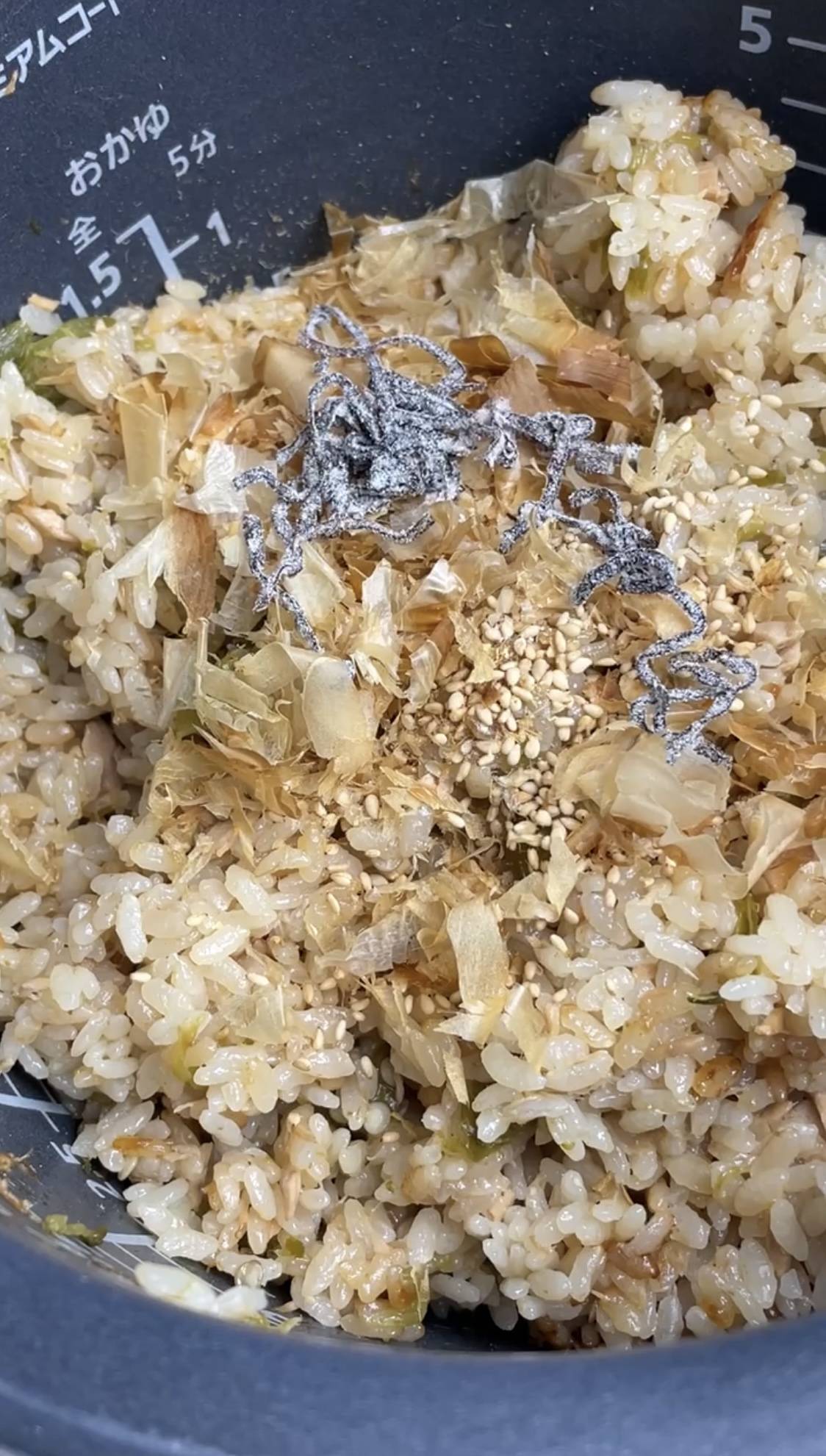 ごま、かつお節、塩昆布を加えて混ぜる