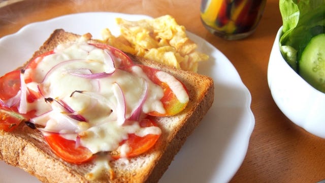 材料 全粒粉食パン:1枚 卵:2個 小さいトマト:1個 レタスやほうれん草:1~2枚 塩と胡椒:適量 作り方 全粒粉食パンをトーストする 卵をボウルに割り入れ、塩と胡椒で味を調える ②をスクランブルエッグにする ①の上にスクランブルエッグ・トマト・レタスを乗せる カロリー(目安)約300~350kcal