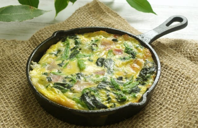 材料 卵:2個 ほうれん草:適量 玉ねぎ:1/4個 低脂肪チーズ:適量 塩とこしょう:お好みで 作り方 卵をボウルに割り入れ、塩とこしょうで味を調える ほうれん草をひとくちサイズ、玉ねぎをみじん切りにする フライパンでオリーブオイルを熱し、ほうれん草と玉ねぎを炒める 炒めた野菜に卵を注ぎ入れ、広げてオムレツ状になるように焼く ④の上に低脂肪チーズを散らし、チーズが溶けるまで加熱する お皿に盛り付けて完成 カロリー(目安)約250~300kcal