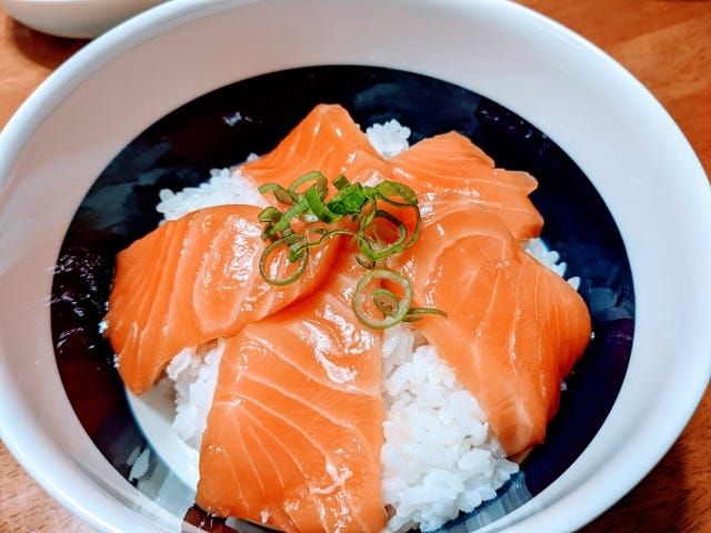 材料 サーモン(刺身用):適量 大葉:数枚 ご飯:お茶碗1杯分(約150g) ごま油:小さじ1 醤油:小さじ1 作り方 大葉を水洗いし、水気を切る サーモンを細切りにする 大葉をみじん切りにする ご飯の上にサーモンと大葉をのせる ごま油と醤油を混ぜ合わせてタレを作り、④の上にかけて完成 カロリー(目安)約450~500kcal