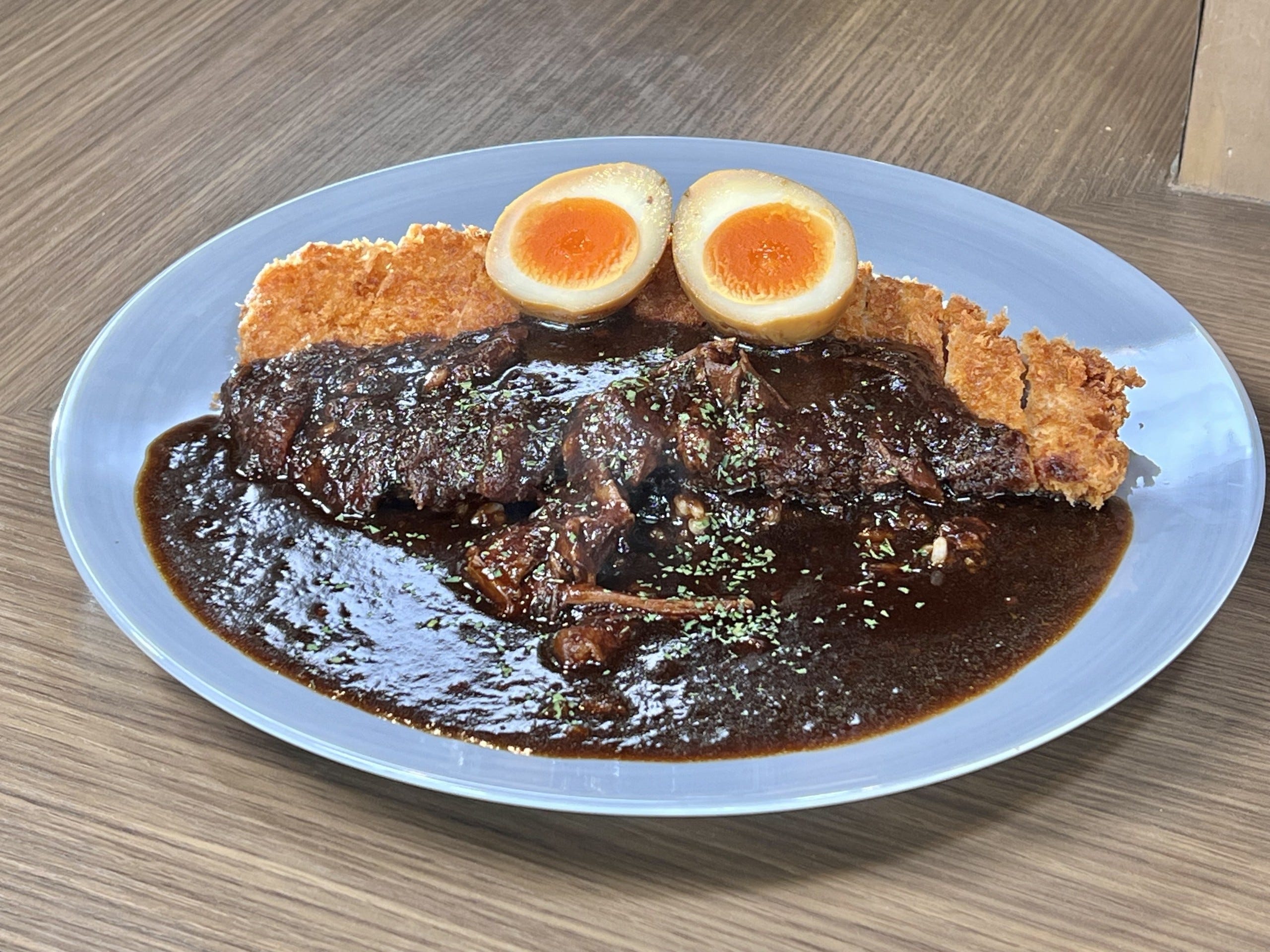 画像:コープこうべコープステーション/「神戸ポークプレミアムカツカレー」(1,200円・税込)/ソース味玉トッピング(150円・税込) 濃厚な色合いのカレールウは手間と時間をかけて仕上げられています。店長の若原さんによると、玉ねぎにりんご、赤ワイン、スパイスなどを配合したルウを8時間煮込んだ後、10日間じっくり寝かせることで、深みのある味わいとまろやかさを引き出しているとのこと。