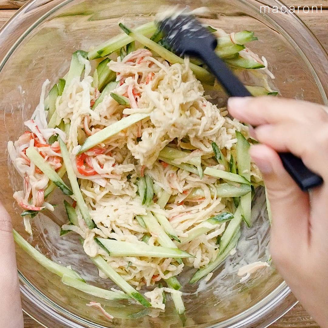 切り干し大根、きゅうり、カニカマを加えて、全体を混ぜ合わせます。器に盛り付けたら完成です。