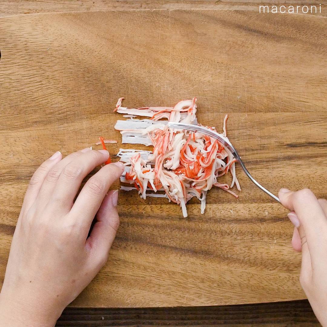 カニカマはフォークでほぐすと簡単にバラバラに仕上がりますよ。