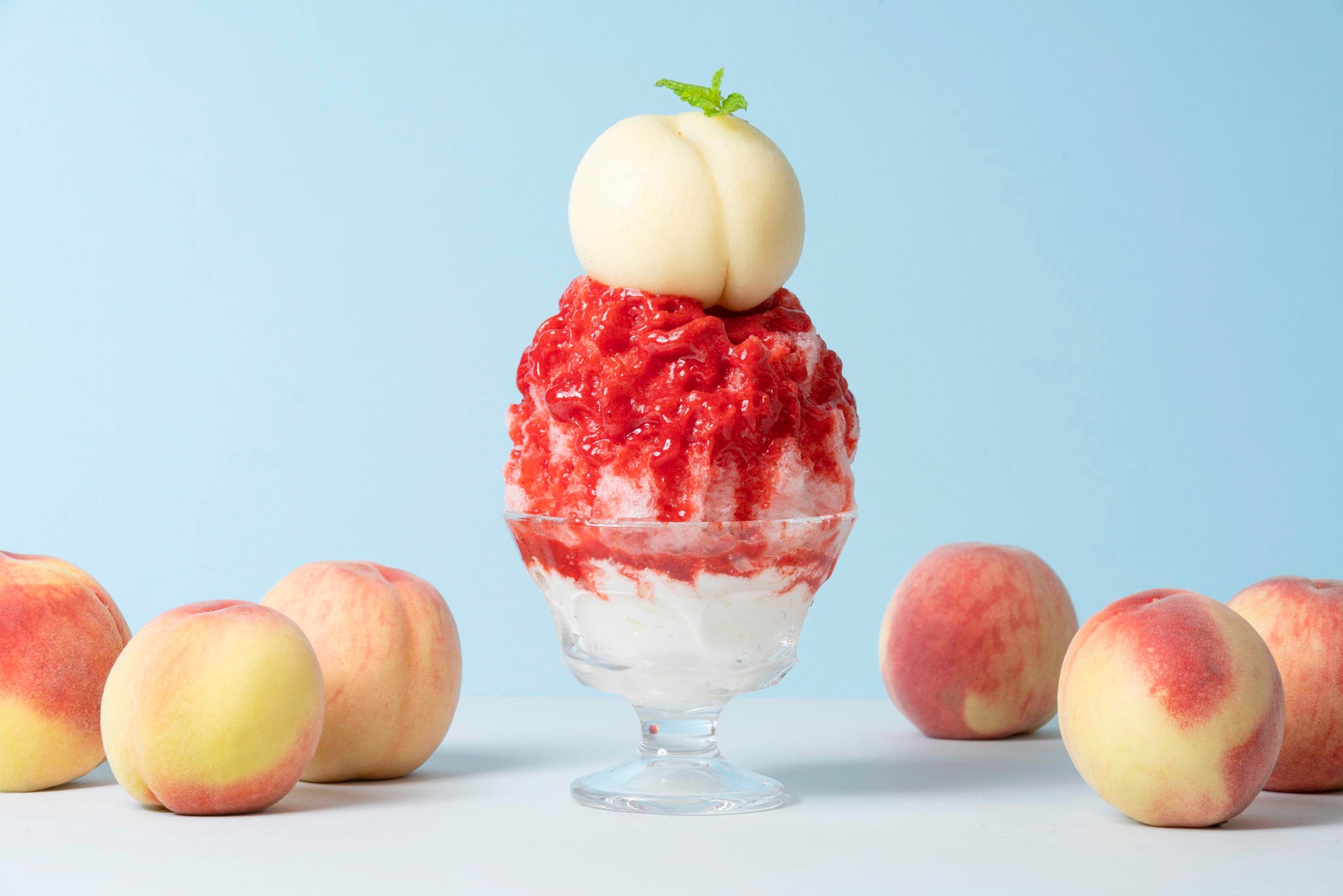 「くだもの丸ごとごろっとシリーズ(桃・すもも)」2,010円 「堀内果実園」の夏季限定かき氷には、果樹専門農家ならではのフルーツを大胆に使ったメニューが並びます。なかでも、人気を集めるのが写真の「くだもの丸ごとごろっとシリーズ(桃・すもも)」です。桃が丸ごと1個ドーンと乗り、真っ赤で甘酸っぱいすももソースがたっぷりかかったインパクト大なビジュアルはもちろん、味わいも絶品。ほかにもフルーツを主役にしたかき氷がたくさんあるので、何度でも訪れたくなりますね!