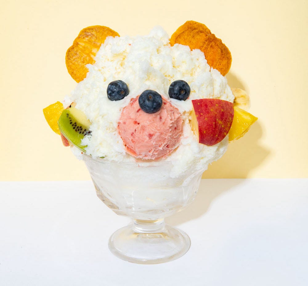 「白くま君」1,800 円 「白くま君」のソースは、ライチとミルクをミックスしたさっぱりフレーバー。口元はいちごジェラートで彩り、キウイ、バナナ、パイナップル、りんご、ブルーベリーのフレッシュフルーツで飾り付け。さらに「堀内果実園」の人気商品である柿チップやドライフルーツをトッピングしています。