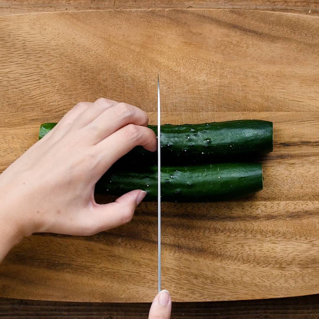 きゅうりはヘタを切り落とし、長さを2等分にします。