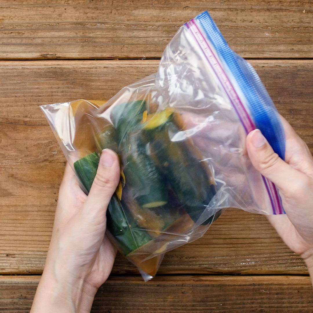 ・漬け込む際の保存袋の代わりに別の容器を使ってもいいですか?保存容器でも問題ありませんが、保存袋を使うと少ない調味料で漬け込むことができますよ。