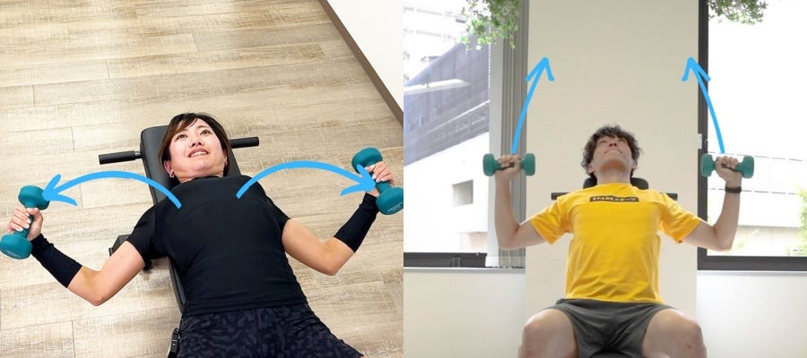ダンベルフライ:大胸筋を意識しながら、ダンベルの動きが弧を描くように動かす ダンベルプレス:肩関節から、ダンベルの動きが斜めにスライドするように動かすほか、以下の違いがあります。