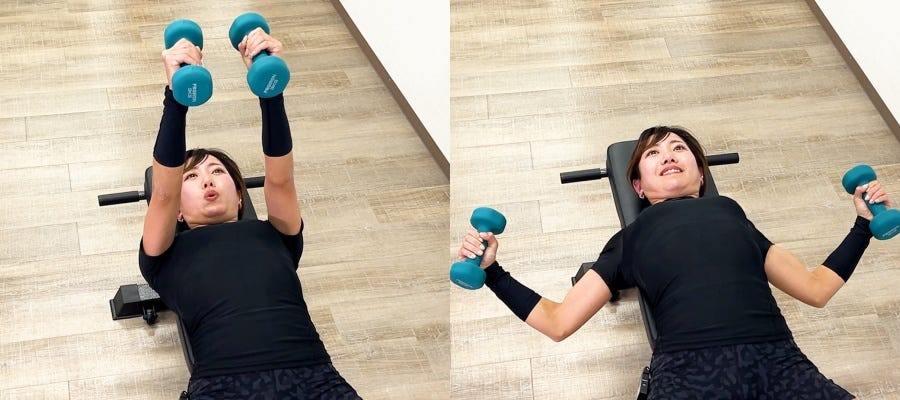 トレーニングベンチに仰向けになり、逆ハの字(V字)ようにダンベルを持つ 胸の前で両腕を上げる 肩甲骨を寄せるように胸を開きながら、両腕を真横に開く