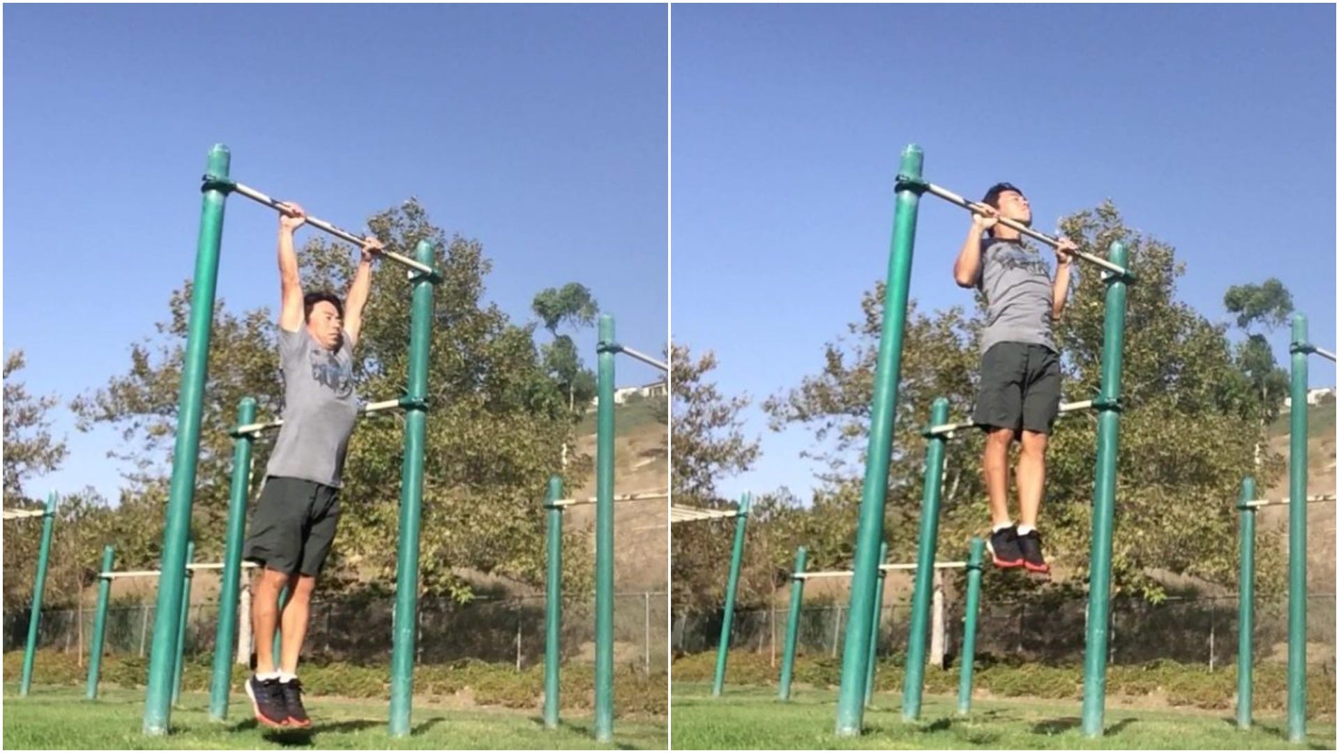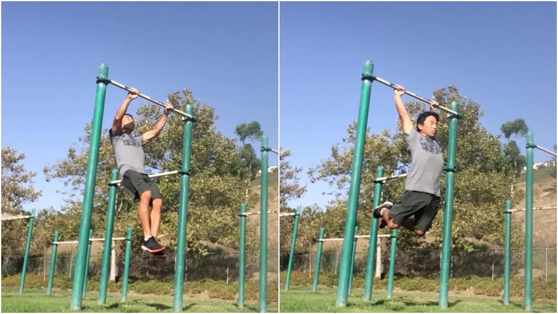 こちらも20~30秒ほど行えるようになったら、あごが鉄棒の上に来るところまでジャンプしてください。この状態で静止します。
