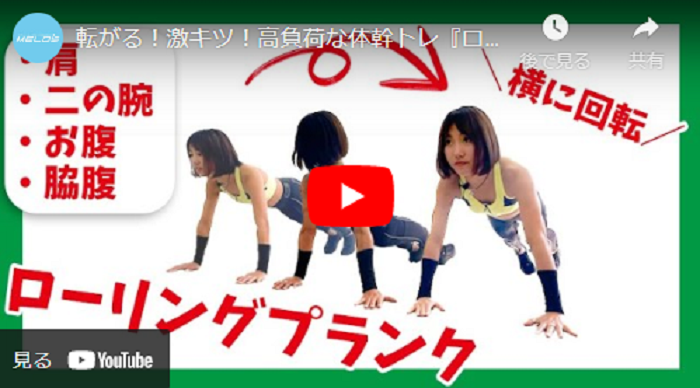 体幹 腹筋 背筋 大腿四頭筋 ローリングプランク体を横に回転させながら、ノーマルプランクとリバースプランクの体勢を繰り返すトレーニング。一般的な“静”のプランクに対して、こちらは“動”のプランクです。