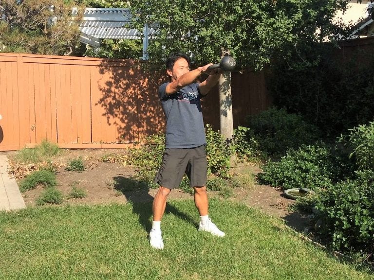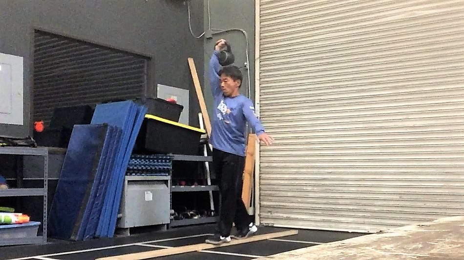 足を肩幅に開いて立ち、ケトルベルを両手で握る ケトルベルを両足の中央に位置させ、膝を曲げ、お尻を後ろに突き出す 腰を前方向に振る反動を利用して、ケトルベルを頭上、あるいは目の高さまで振り上げる