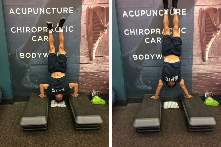 すでに逆立ちができる人は、逆立ちをしながら腕立て伏せを行う、逆立ちのまま手で歩行を行うといったステップアップしてみましょう。筋肉量の維持、バランス感覚の向上にも役立ちます。