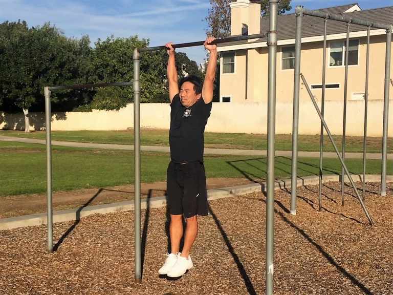 ぶら下がりホールド 手の平は前に向けて、手の幅が肩幅と同じぐらいの広さの位置で握る 鉄棒から肘を完全に伸ばしてぶら下がる 30秒キープする