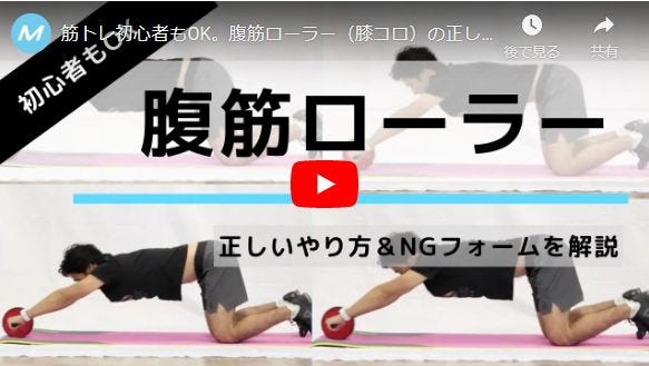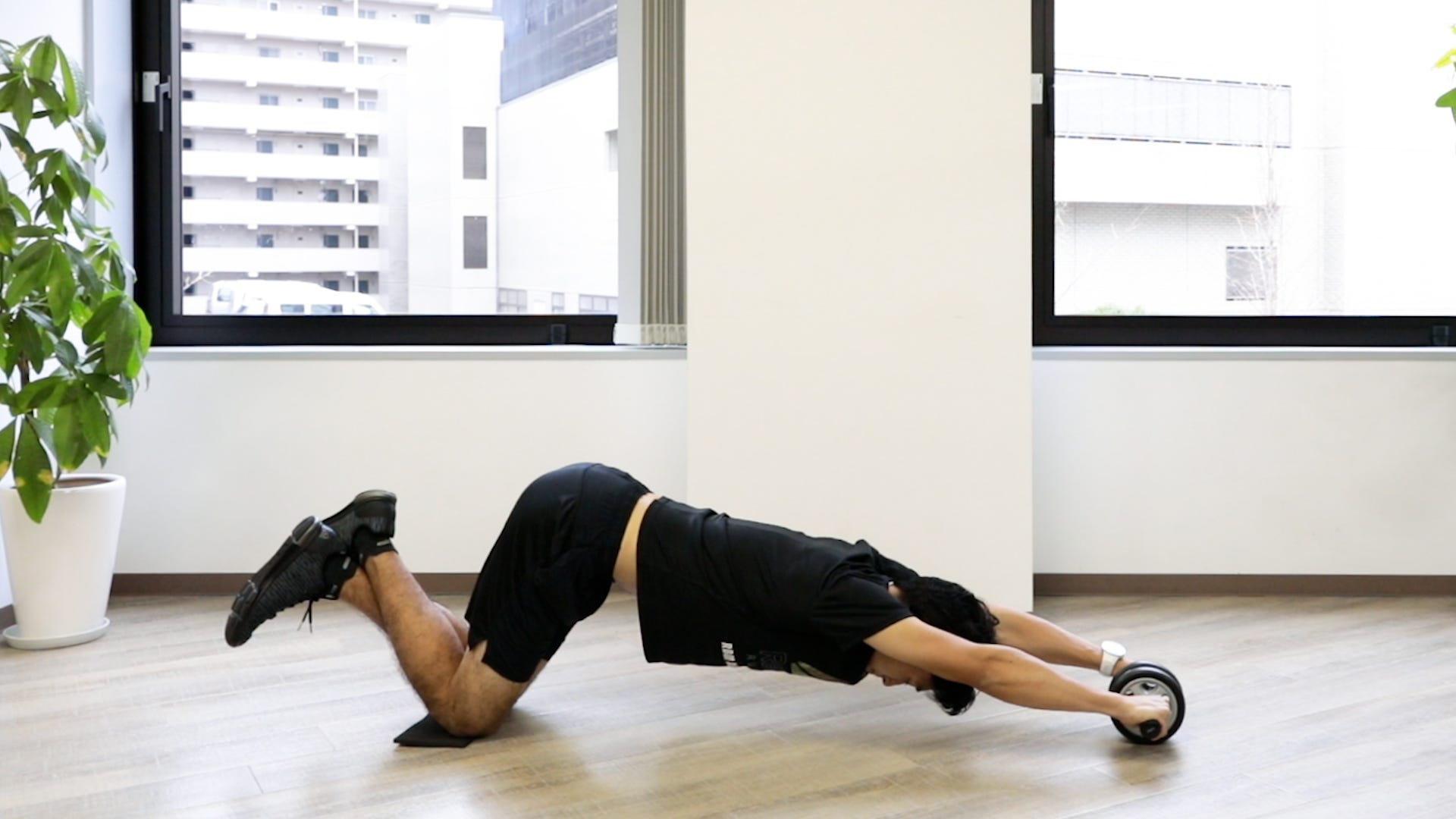 膝つき腹筋ローラーのやり方 両膝を床につけて、グリップを握る ローラーを前方に転がしながら、体をゆっくりと前へ伸ばす これ以上伸ばせないところでストップし、伸ばしたときと同じスピードを保って元の位置に戻る
