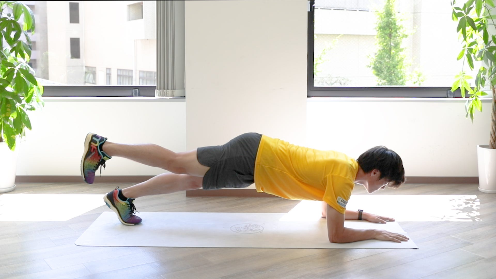「ワンレッグプランク」は、プランクの姿勢から片足を浮かせるエクササイズです。足を浮かせたときにしっかり腹筋を意識し、カラダの一直線を保ったまま行なうことがとても大切です。