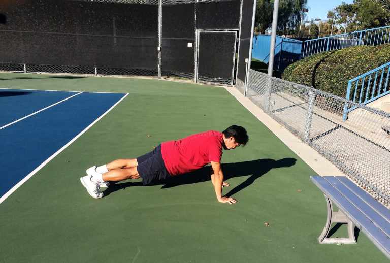 両手を肩幅よりやや広めに床に置き、肘を伸ばす 肘を曲げ、胸が床につくまで体を下ろす 床で静止した後、体をまっすぐ上へと押し上げ、はじめの姿勢へと戻る