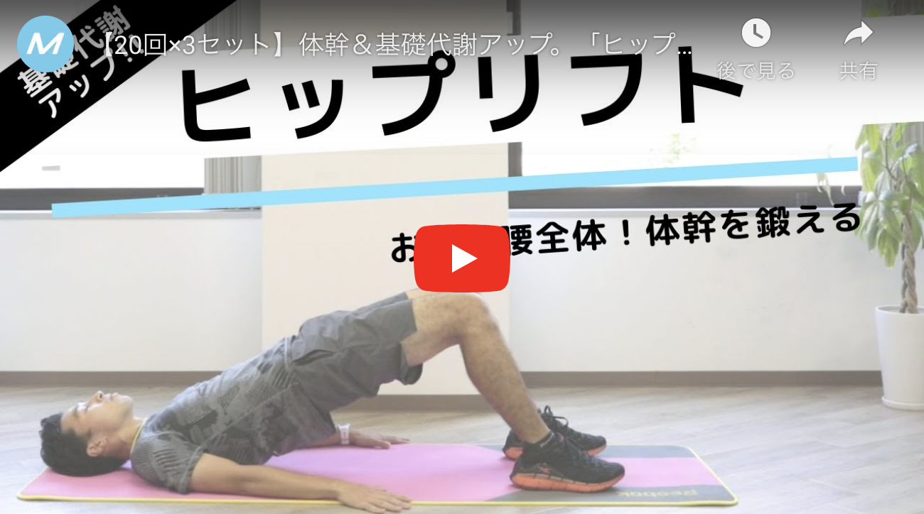腹筋をはじめ、背筋や太ももなどが鍛えられる体幹トレーニング「ヒップリフトブリッジ」。基礎代謝も上がる効果も期待できます。