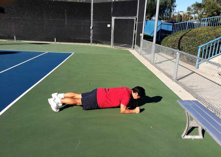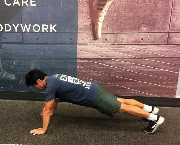 腕を肩幅広げて、上体を起こす つま先を立てて、下半身を起こす 片方のつま先で体を支えて、片足は肩の位置まで持ち上げる 左右交互に行なう