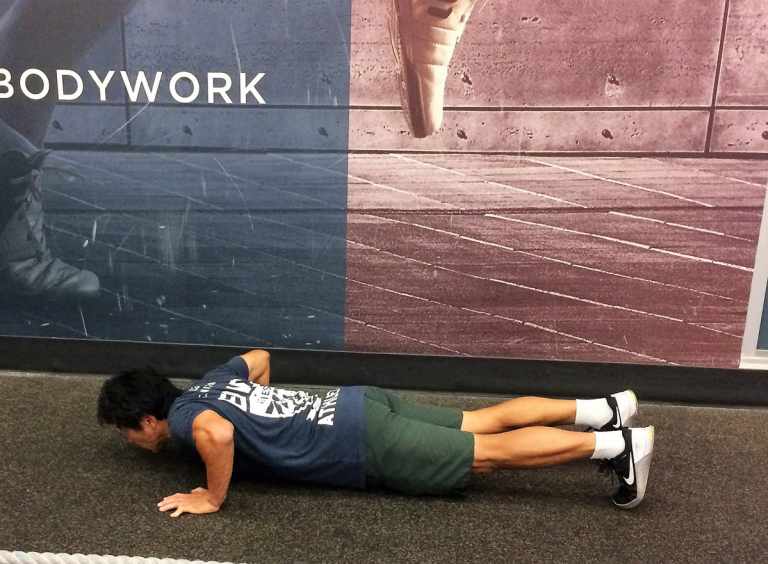うつ伏せで横になる 上半身を起こして腕を肩幅に広げる 下半身を持ち上げてつま先を立てる お尻を限界まで上げる