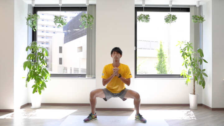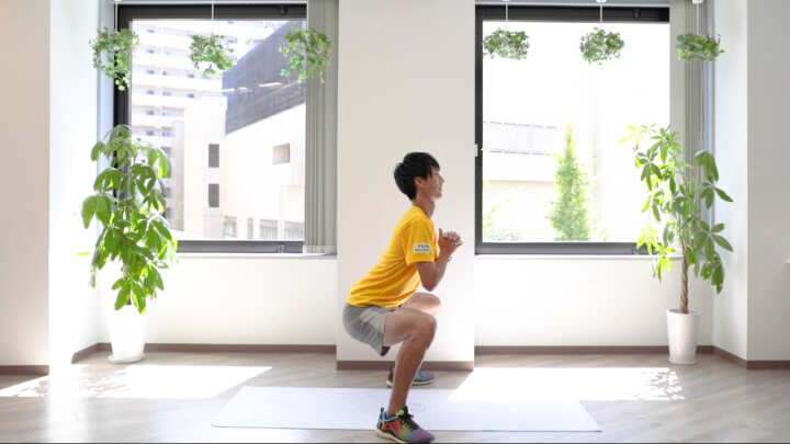 太ももが床と平行になるまで下ろしたら、ゆっくりと元の姿勢に戻る 実施回数15回×3セット