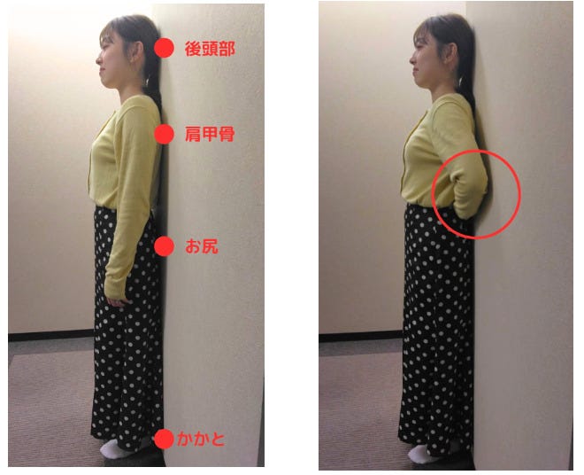 つま先を軽く開き、かかと・お尻・肩甲骨・後頭部を壁につけて立つ 腰と壁の間に手のひらを入れ、空き具合をチェック!