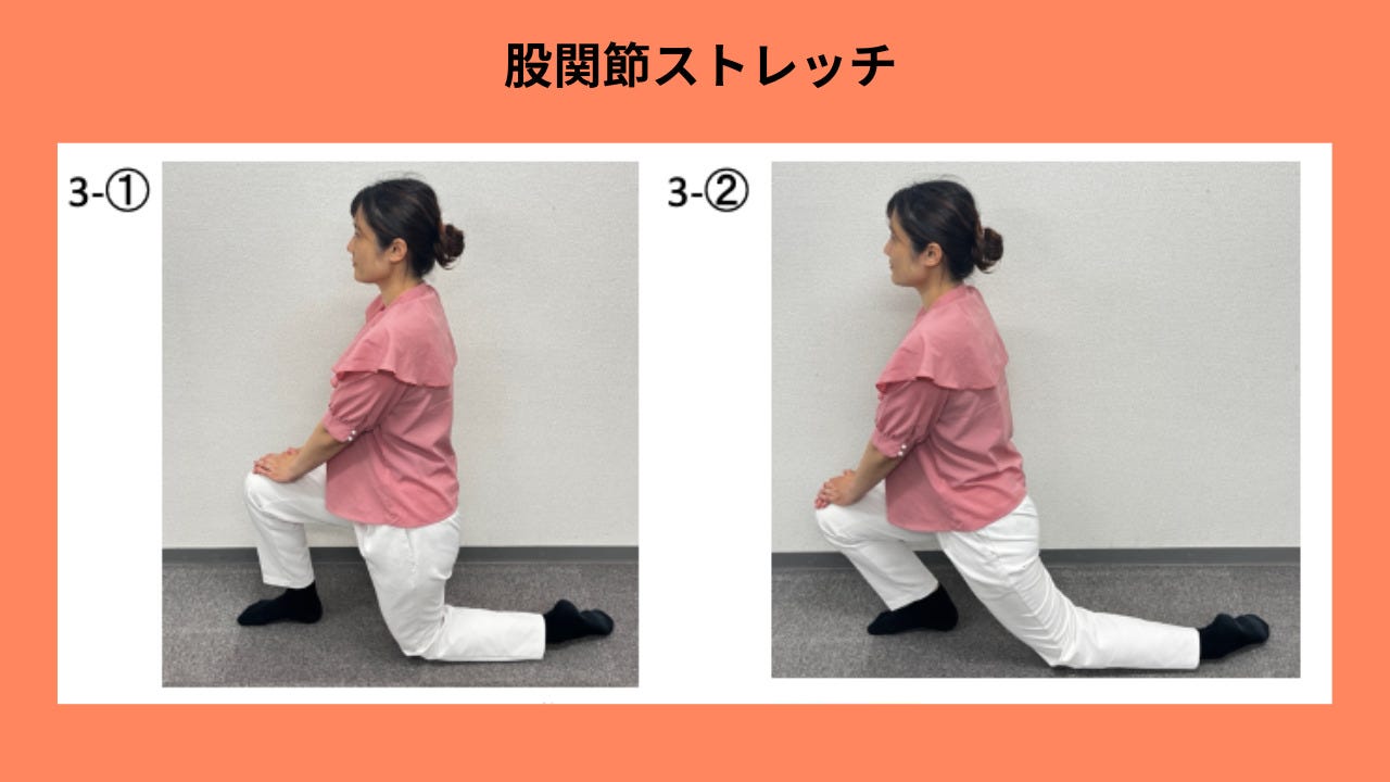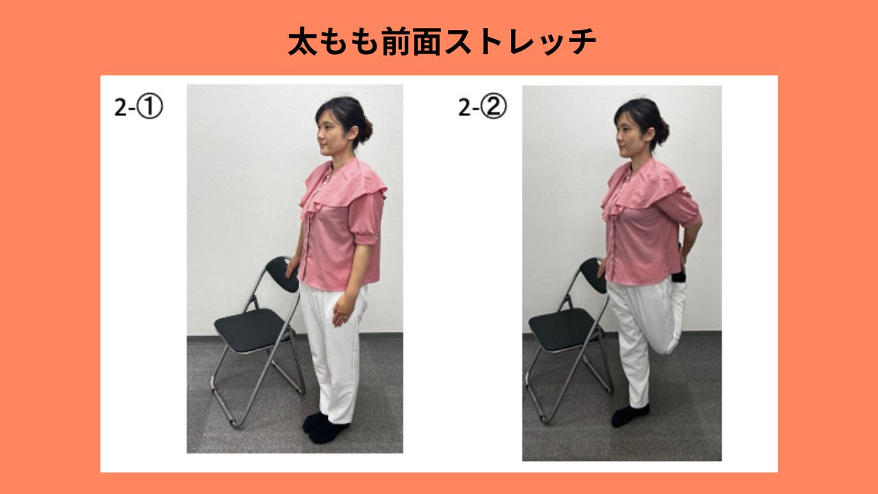 太もも前側の筋肉の柔軟性を高めるストレッチ。腰を反らさないよう注意しながらしっかり伸ばすのがポイントです。