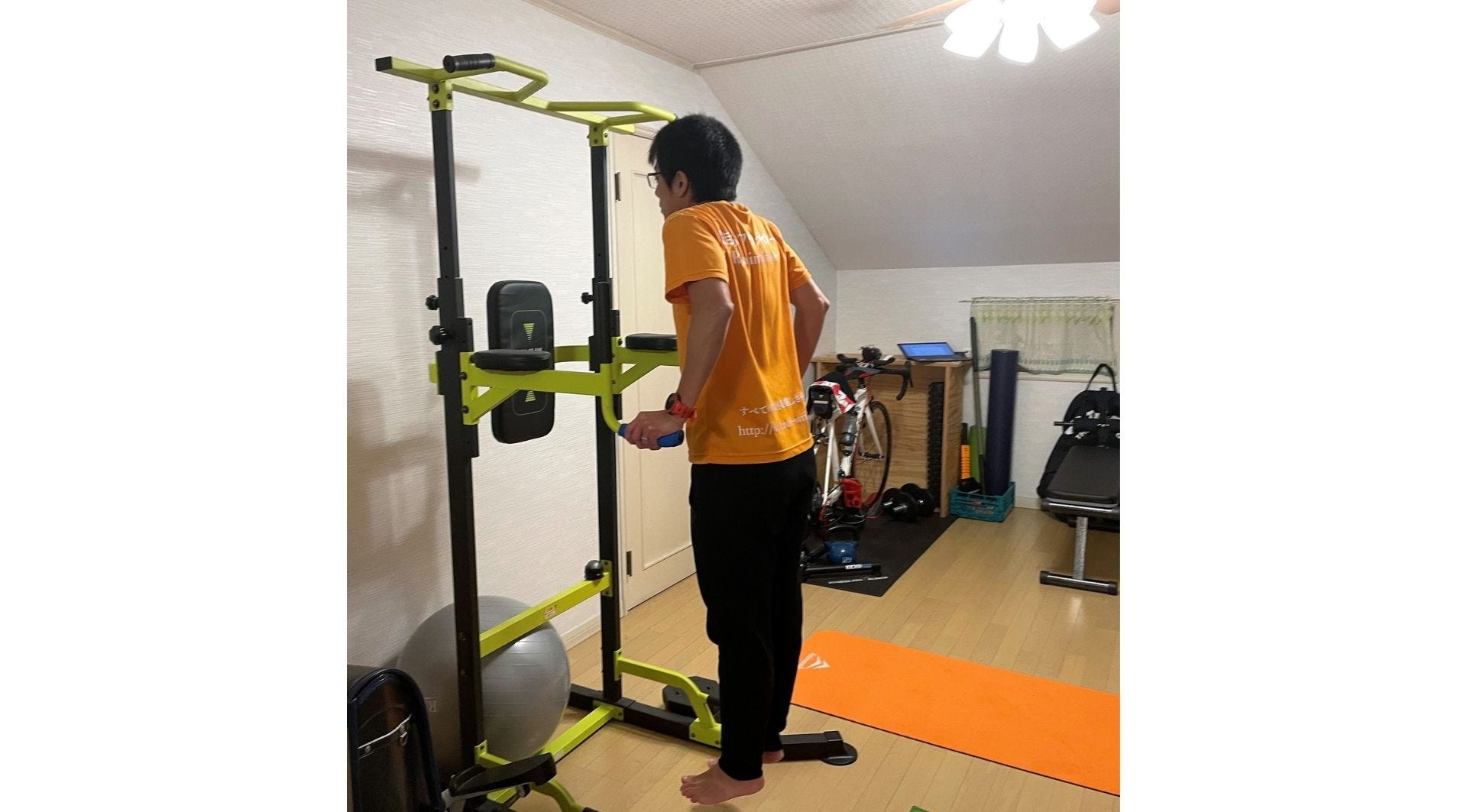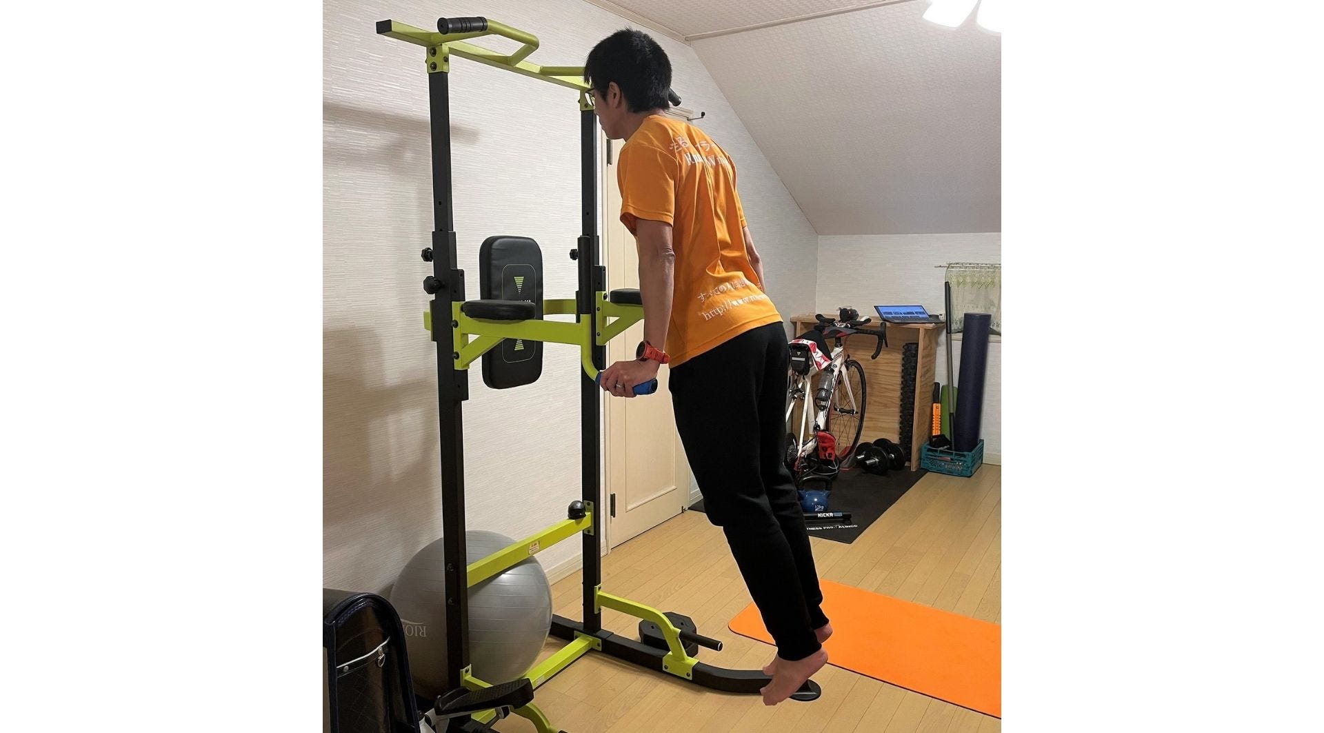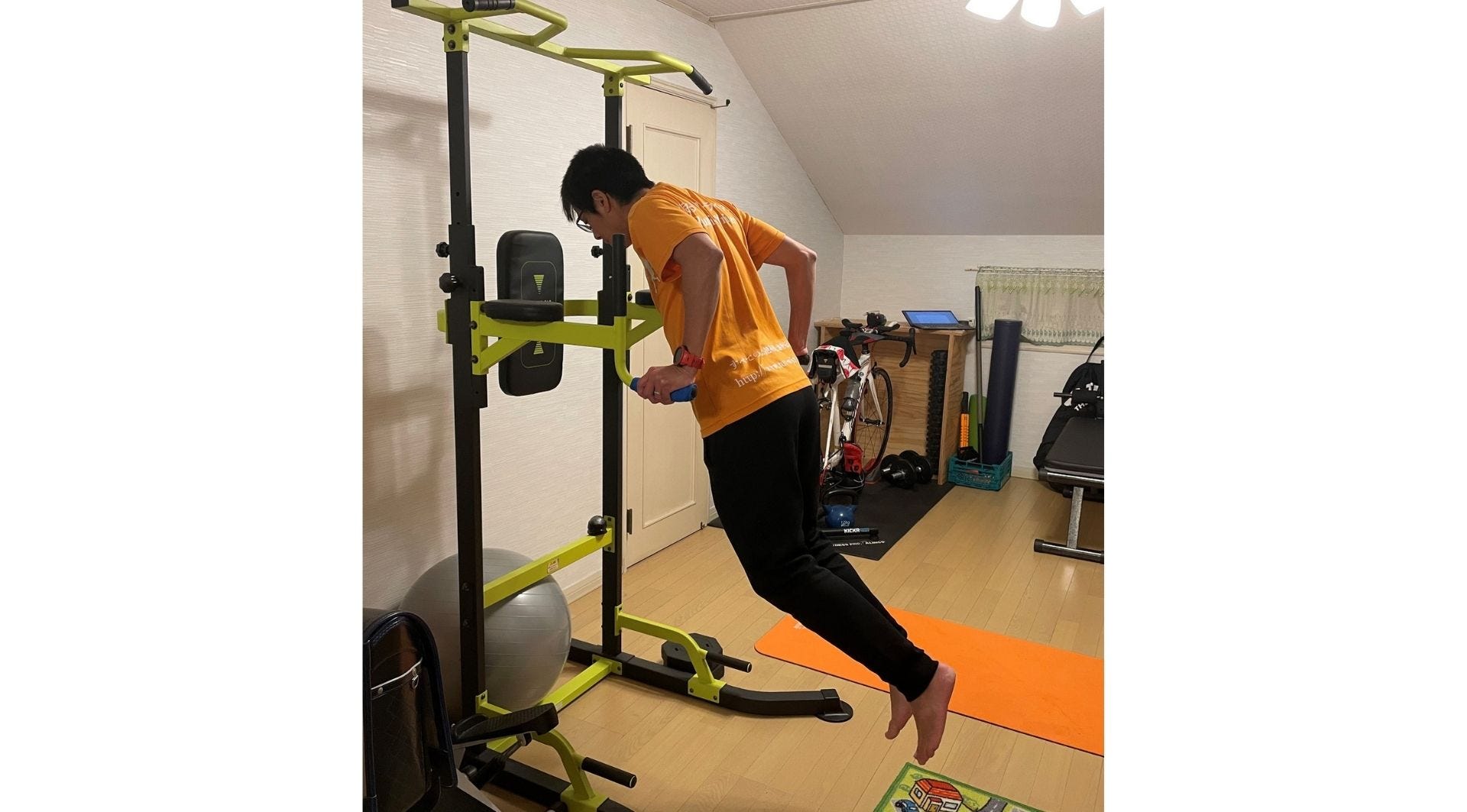 両手でディップスバーを握り、カラダを持ち上げます。脚はまっすぐ伸ばすか、ヒザを曲げて後ろで組み、カラダを安定させましょう。