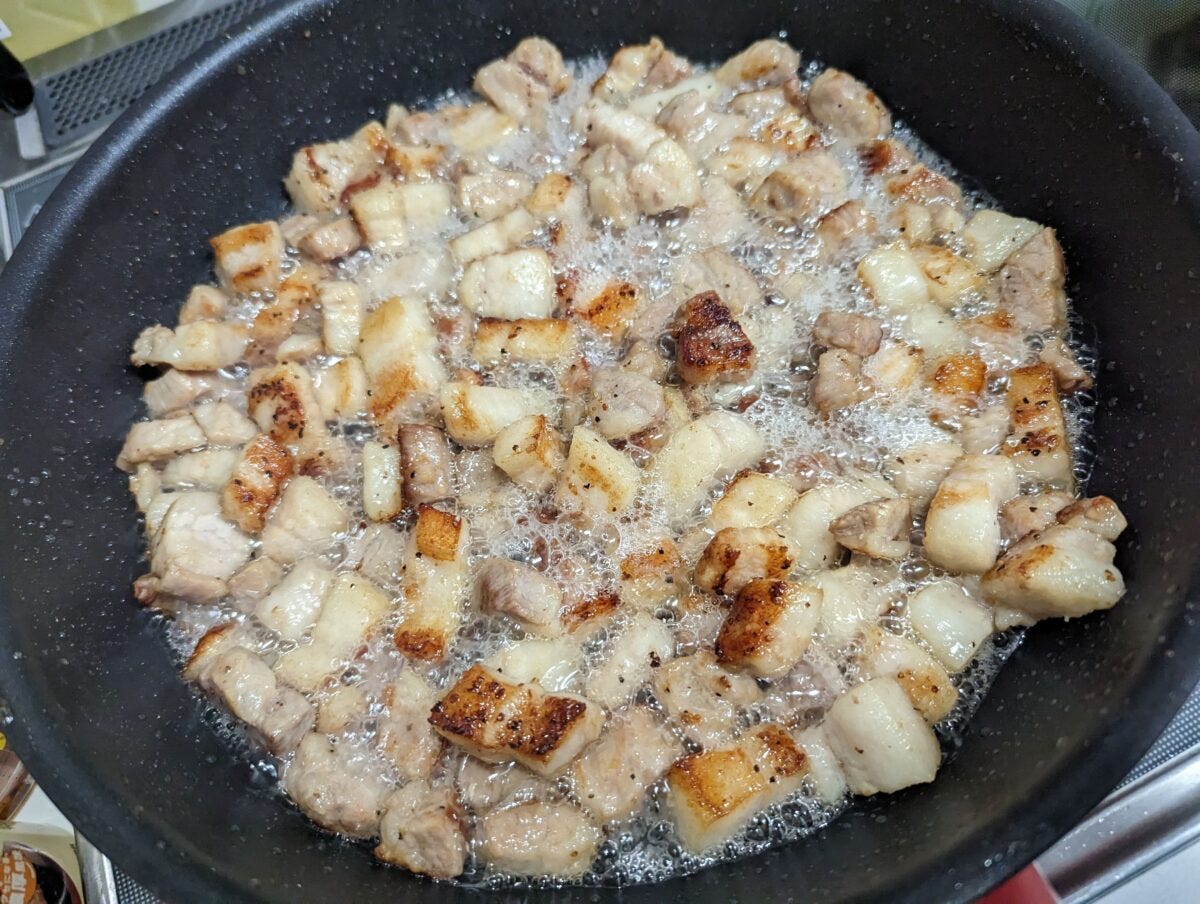 フライパンにサラダ油を熱し、豚肉をカリカリに炒める。塩、胡椒で味を調えたら、一度取り出す。