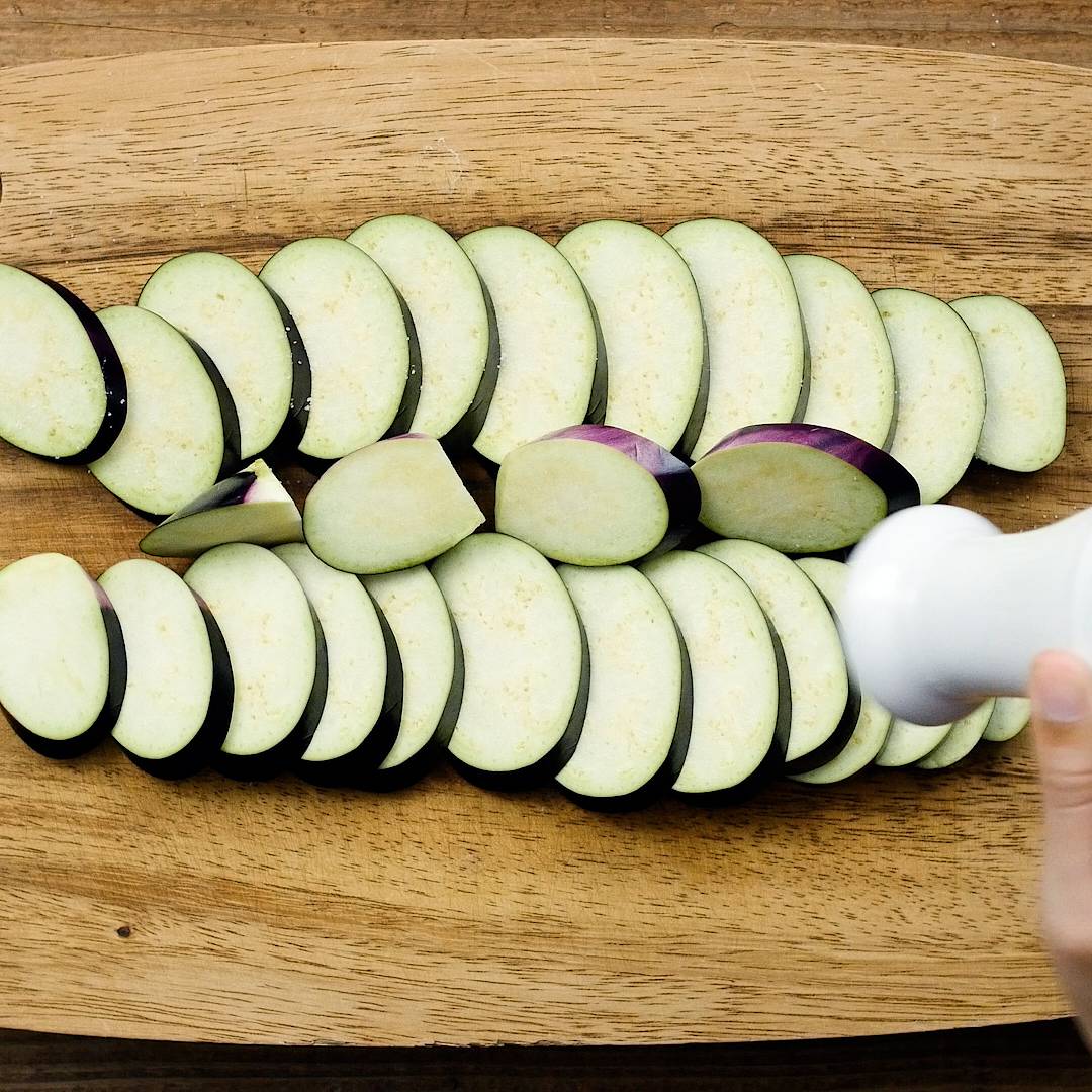 コツ・ポイント なすを薄切りにして塩を振り、水けをふき取ることで余分な水分を抜きます。これにより、アク抜きや変色を防ぐことができます。
