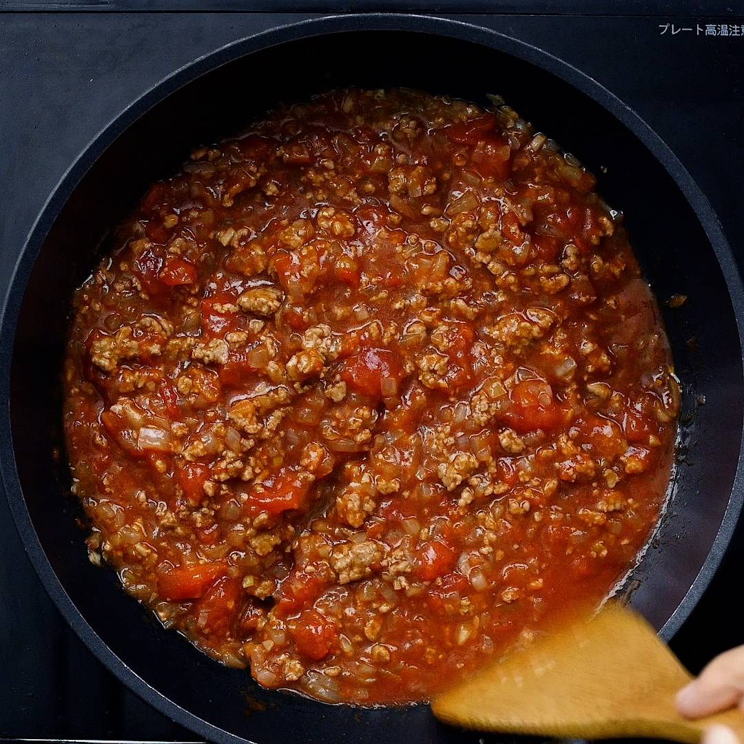 ひき肉を加えて弱火でそぼろ状になるまで炒め、(a) を加えて中火で10分ほど煮込みます。