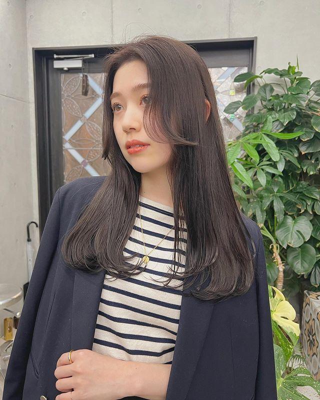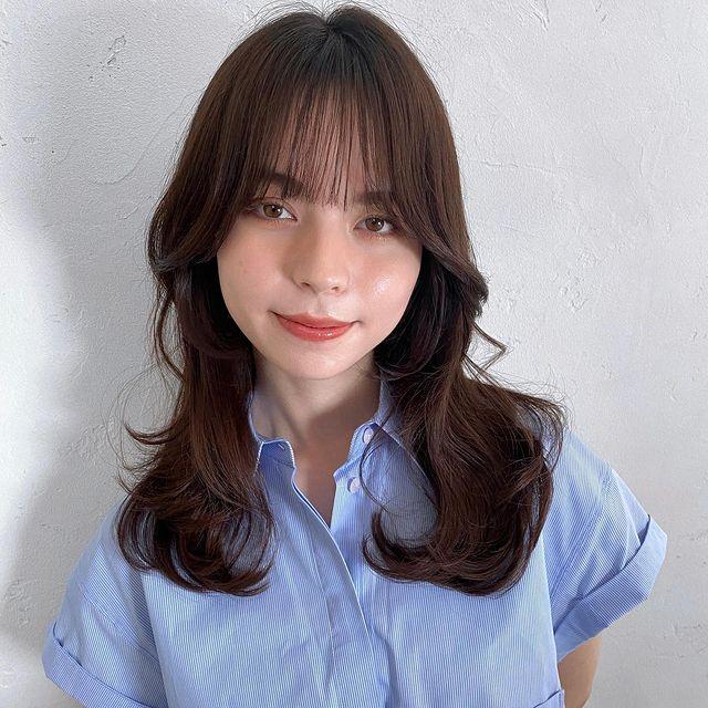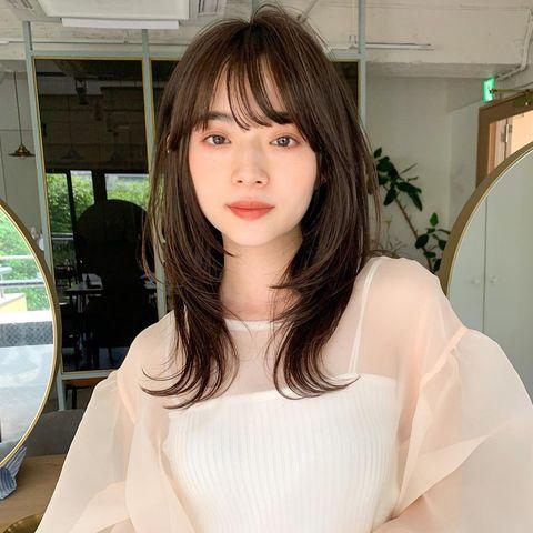 長さがありながらも軽さを感じさせるシースルーバングのミディアムレイヤーは、1つ結びやまとめ髪などのアレンジが楽しめる髪型です。