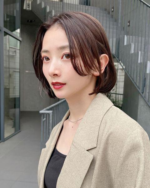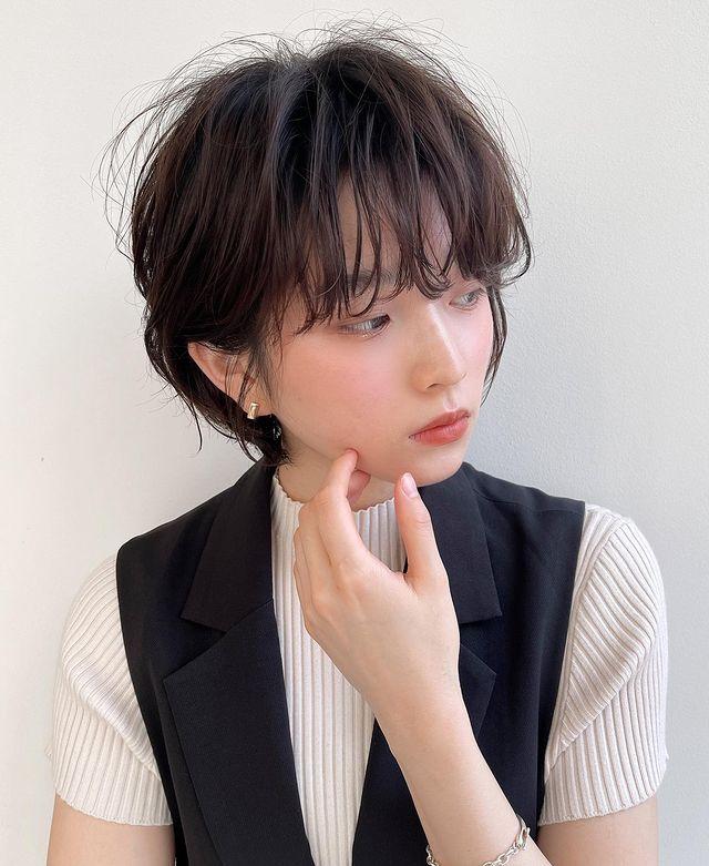 チーク位置よりも長めにカットした前髪をセンターパートにすることで、30代40代にも似合う大人ショートになりますね。