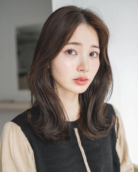 エレガントな韓国風のヘアスタイルは、頬骨よりも低めの位置で横に広がる髪型が特徴的。二重あごをさりげなくカバーしてくれるひし形のシルエットを生み出します。