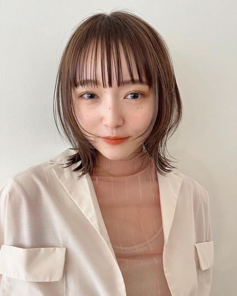 さらに、二重あごを目立たなくするためには、毛先の外ハネがポイントです。こちらの髪型では、前髪をシースルーバングにして抜け感をプラスしています。