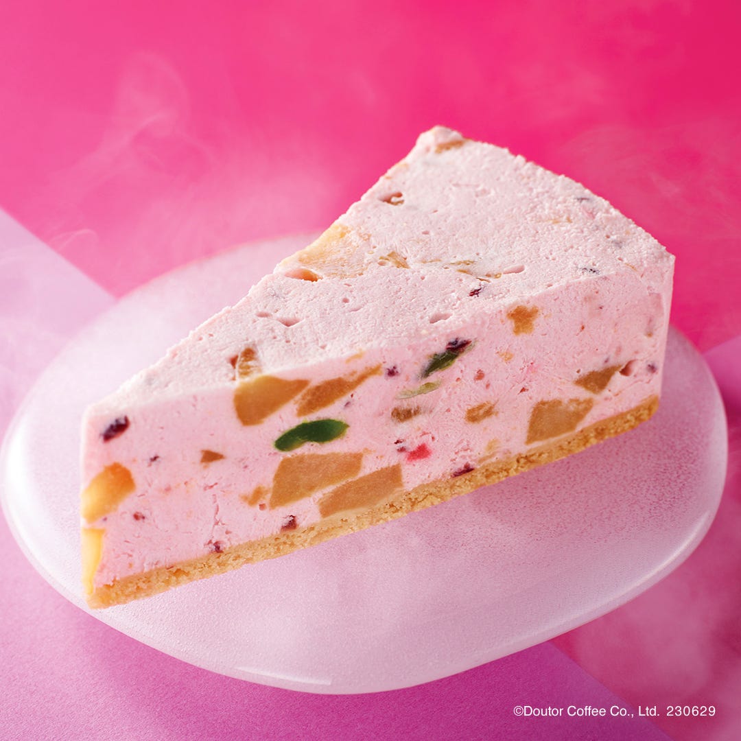 暑い夏に食べたくなる、ひんやりスイーツの桃のアイスケーキを数量限定で用意。クッキー生地の土台にのせた、ほんのり甘い桃のアイスケーキの中には、桃のダイスカットや、赤と緑の2種類のドレンチェリー、ドライクランベリーが入っており、断面の美しさも華やか。