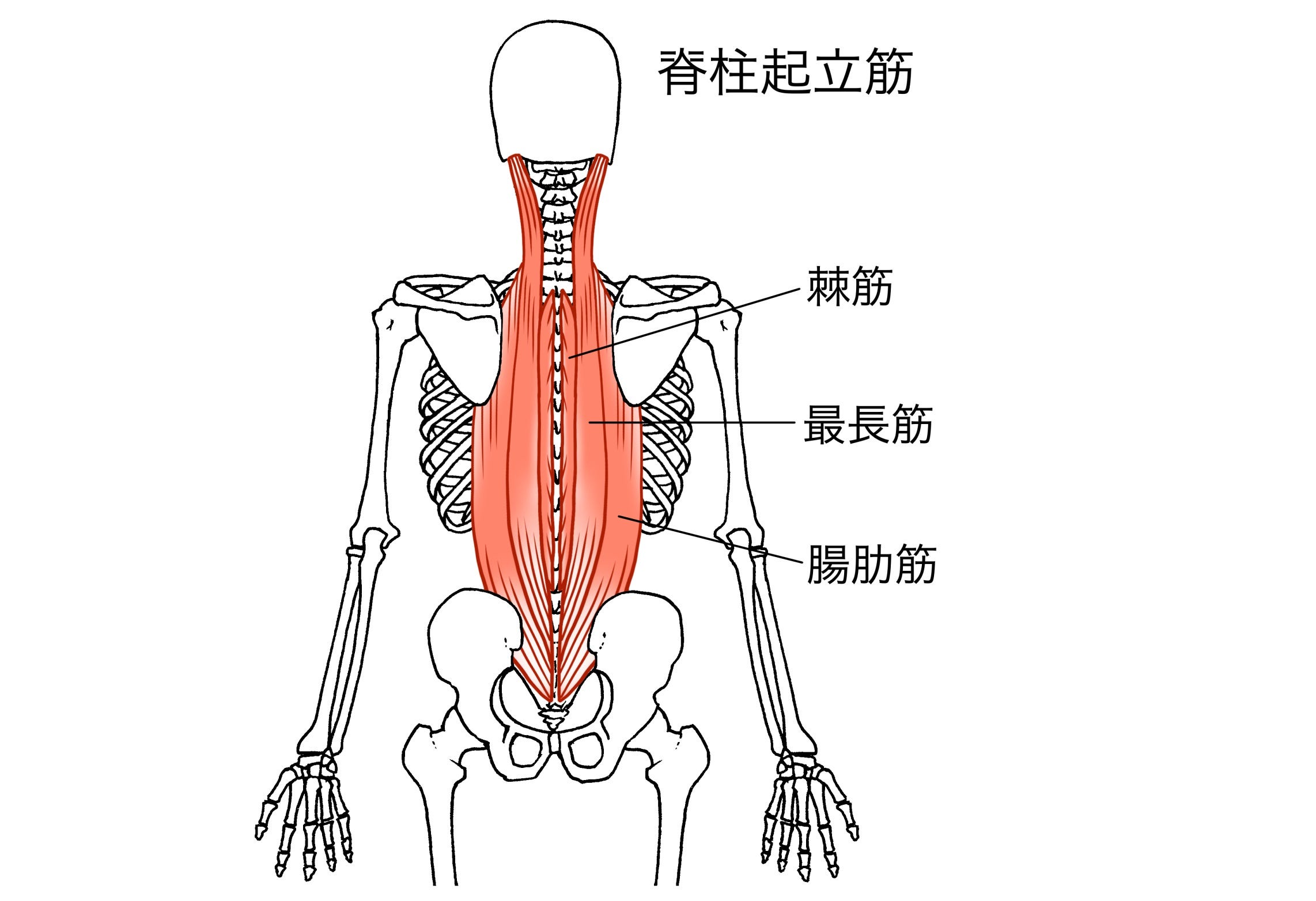 脊柱起立筋は、腸肋筋(ようちょうろくきん)と最長筋(さいちょうきん)、棘筋(ちょくきん)の3つの筋肉を合わせた総称で、背骨から骨盤にかけて背骨の両側を走行している筋肉です。