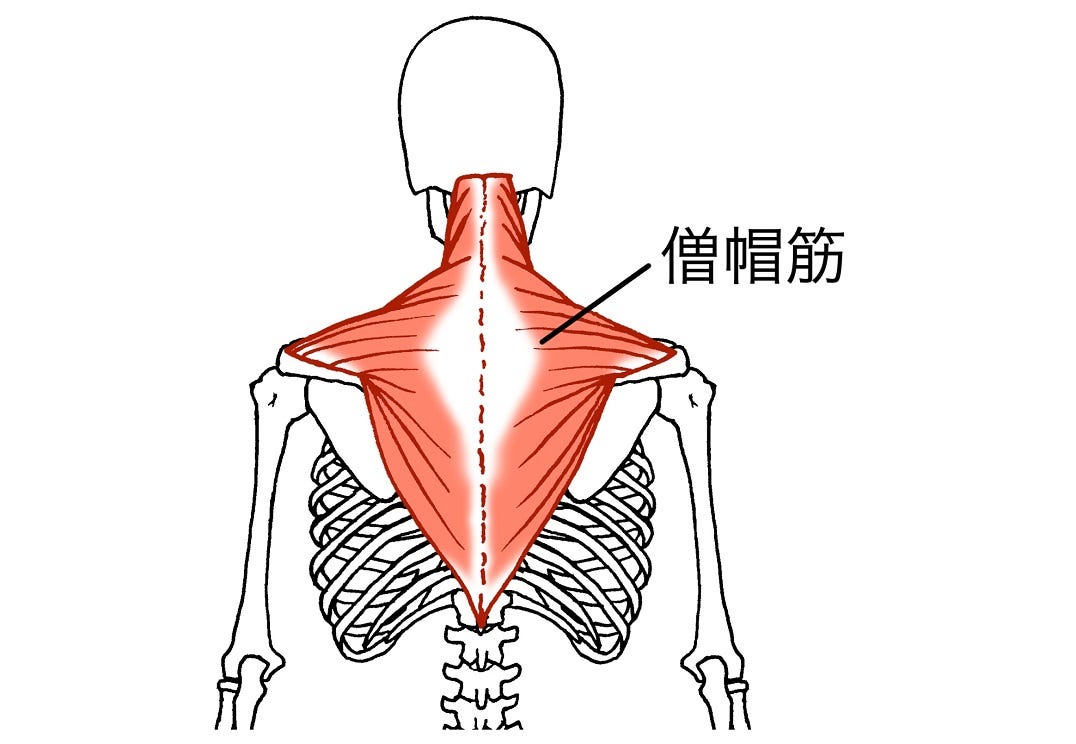 僧帽筋は首から背中を覆っている広い筋肉で、頭蓋骨から背骨に付着し、鎖骨や肩甲骨に向かって走行しています。僧帽筋も、上部・中部・下部と分けて鍛える場合があります。