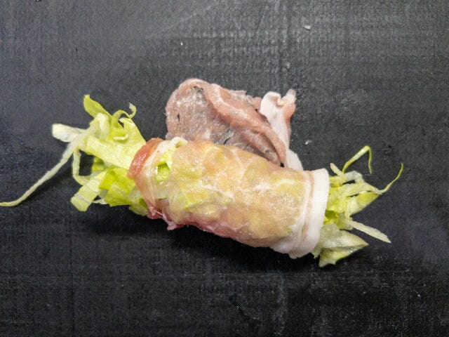 ③ ②のレタスを15〜20gずつ、豚肉薄切り肉できつめに巻きます。