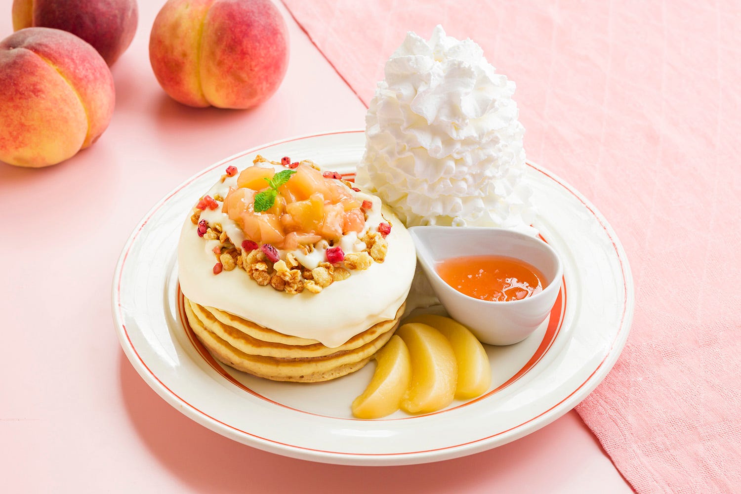旬の桃を味わえる『白桃のパンケーキ』は、さっぱりとしたチーズクリームにたっぷりの白桃をのせたパンケーキ。桃のジュレをかけることで桃の香りがさらにプラス!