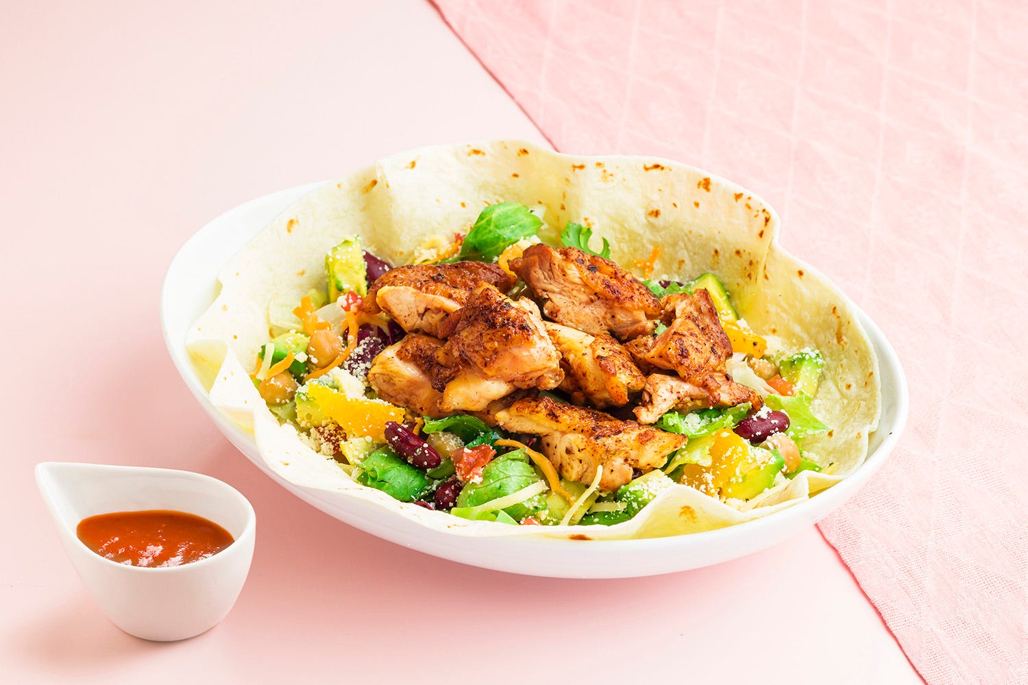 『ケイジャンチキンサラダ』は、トルティーヤの上にスパイシーなチキンやレタス、アボカド、オレンジなどを合わせ、飽きなく食べることができちゃう夏バテ防止のパワーサラダ。