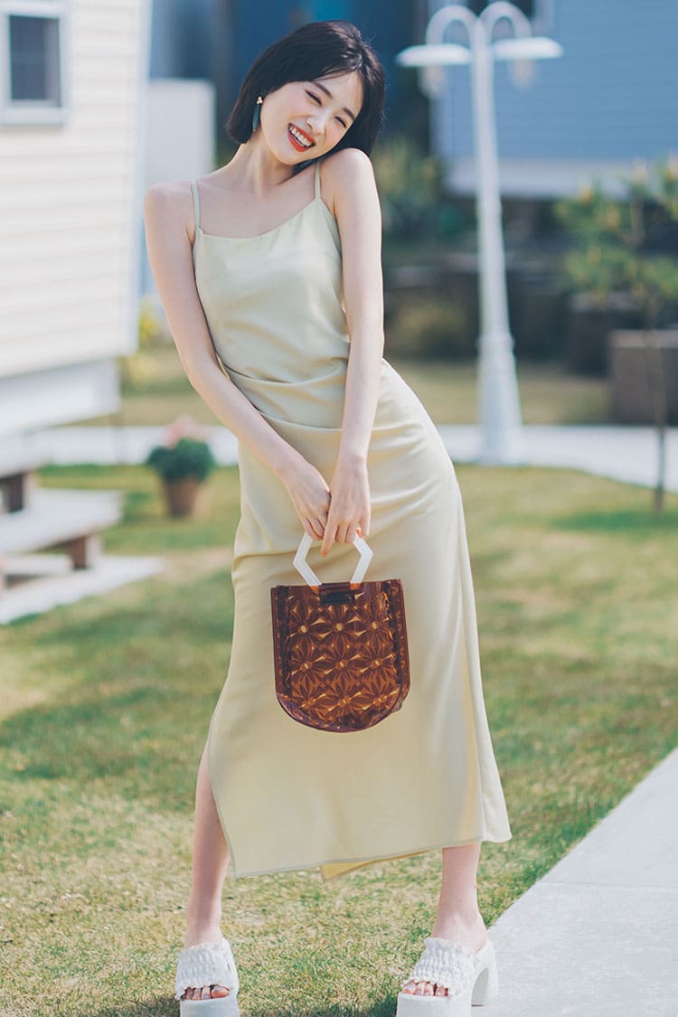 ドレッシーでシンプルなデザインのキャミワンピース。デザイン物のフリル白ミュールやブラウンバッグと相性抜群♡ 派手過ぎない控えめなイエローだから大人っぽさをしっかり残しつつ、華やかで明るい印象にもなれちゃう。