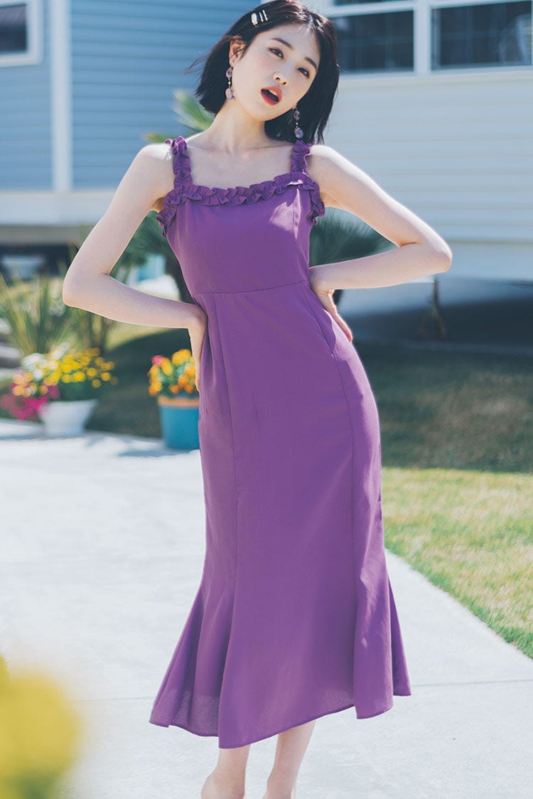 ロングワンピ派さんはキャミ一択! ワンピはロング派というぷりかわ乙女は、とにもかくにもキャミワンピースのご用意を!縦のシルエットが強調される丈感と絶妙な肌見せで着痩せスキルが高まるよ。 Check!1 フリルとマーメイドで脱ぎゃるみパープル ハイウエストでマーメイドっぽいシルエットでスタイルアップが叶う!胸元がスクエアになってるから鎖骨をキレイに見