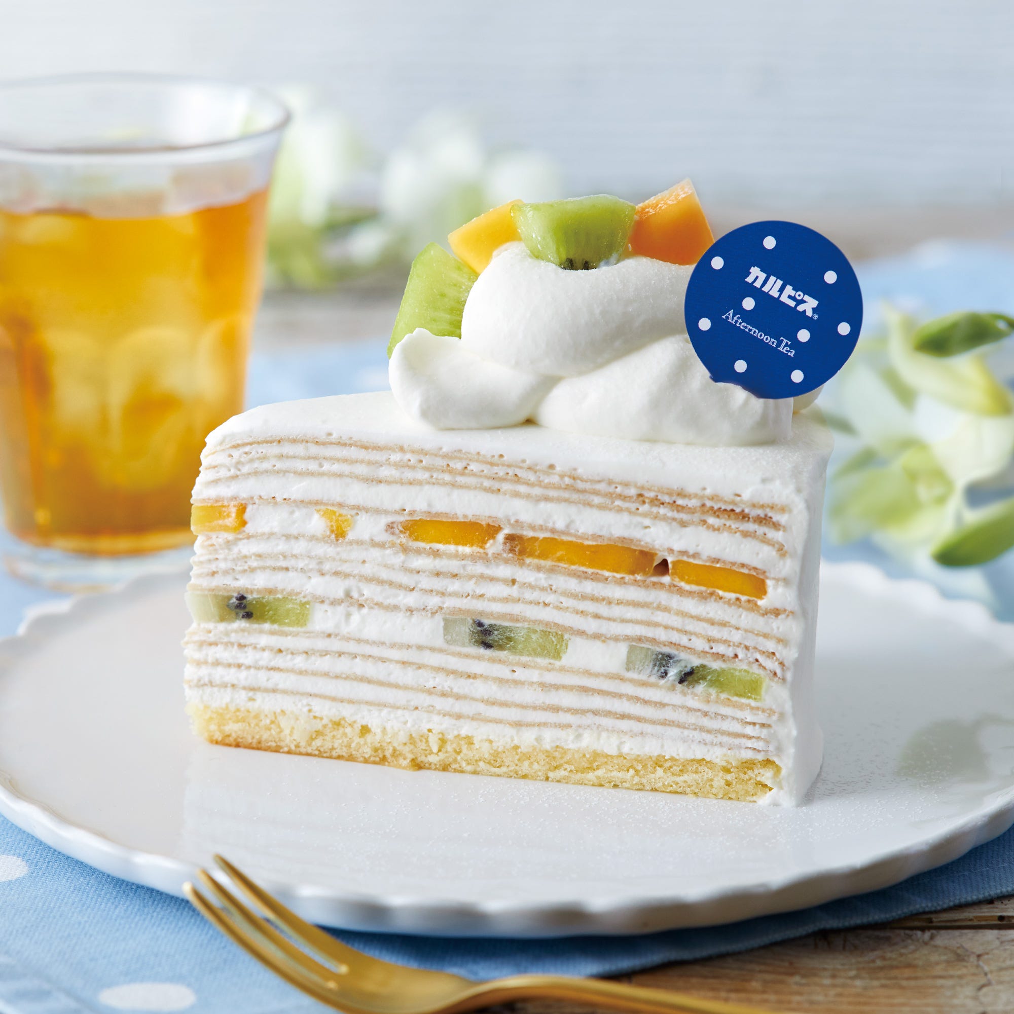 「『カルピス』のフルーツミルクレープ」(お茶付き)1,683円/「アフタヌーンティー・ラブアンドテーブル」で提供 こだわりのクレープ生地に甘ずっぱく軽やかな口当たりの「カルピス」のホイップクリームとマンゴー、キウイを重ね合わせ、さらにたっぷりの「カルピス」のホイップクリームで仕上げています。「カルピス」の甘ずっぱいおいしさを存分に味わえる一品です。