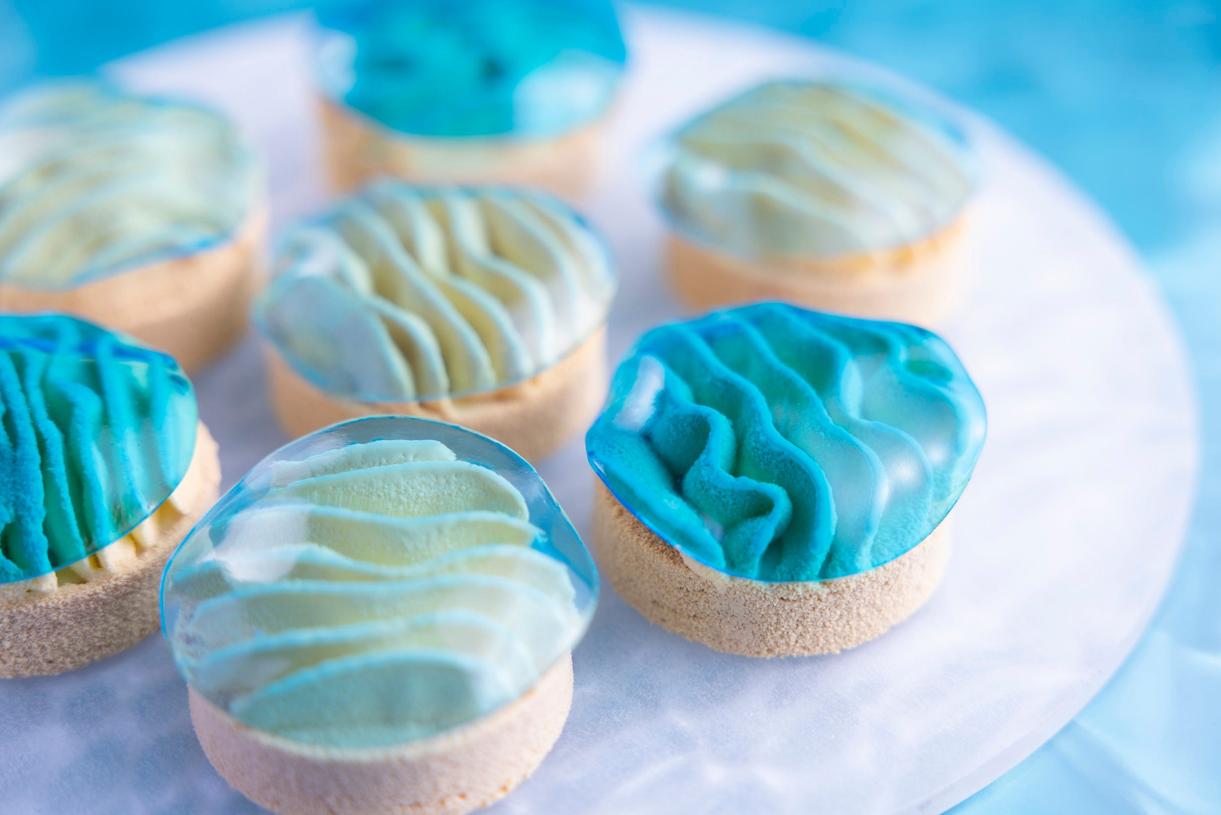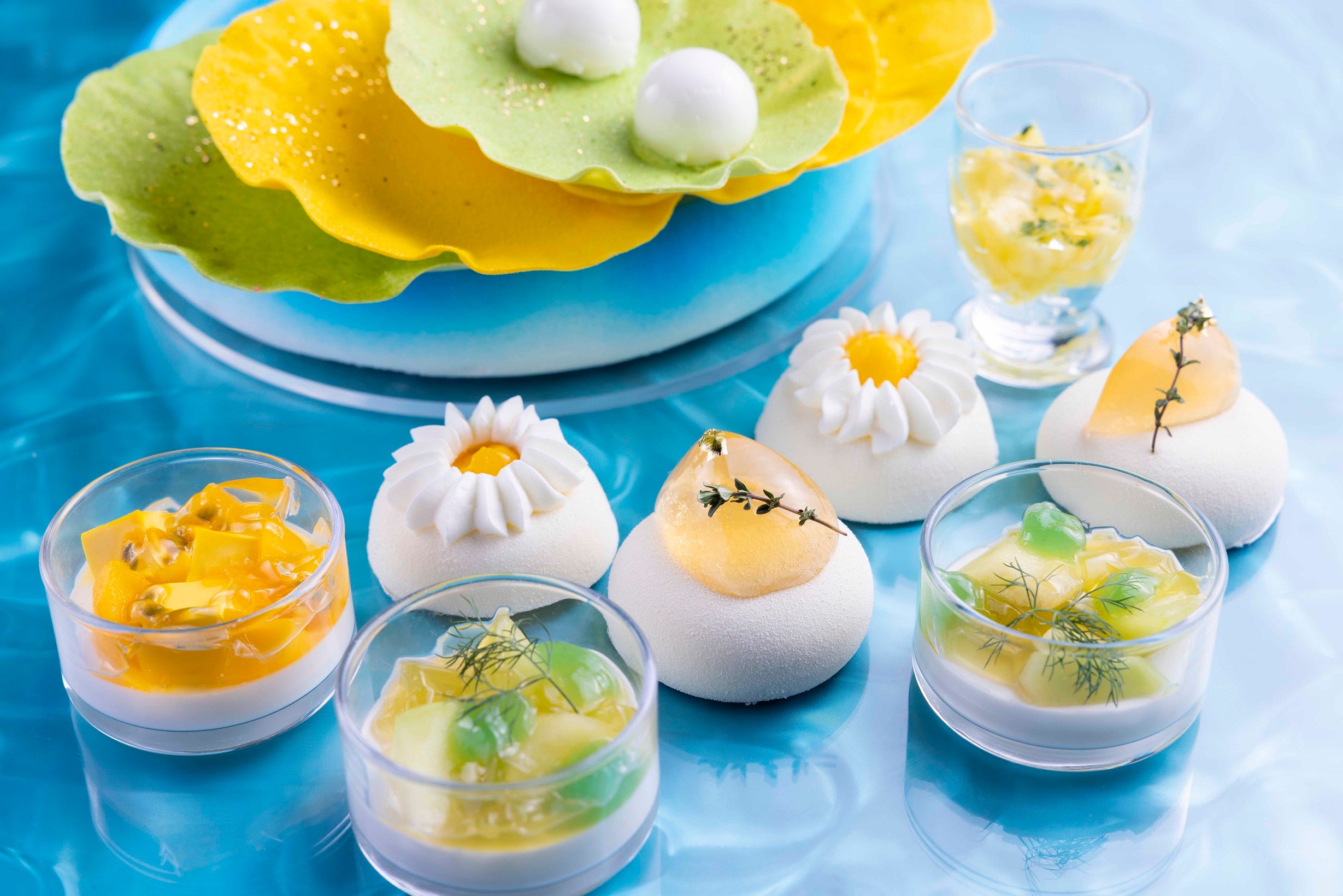 「ヴィーガンスイーツ」や「シークワーサームース」などイメージ 今回紹介した以外にも、マンゴーやスイカ、メロンなど、夏のフルーツをつかったヴィーガンスイーツや、サンゴ礁や真珠をイメージしたスイーツなど、約20種のラインナップ。