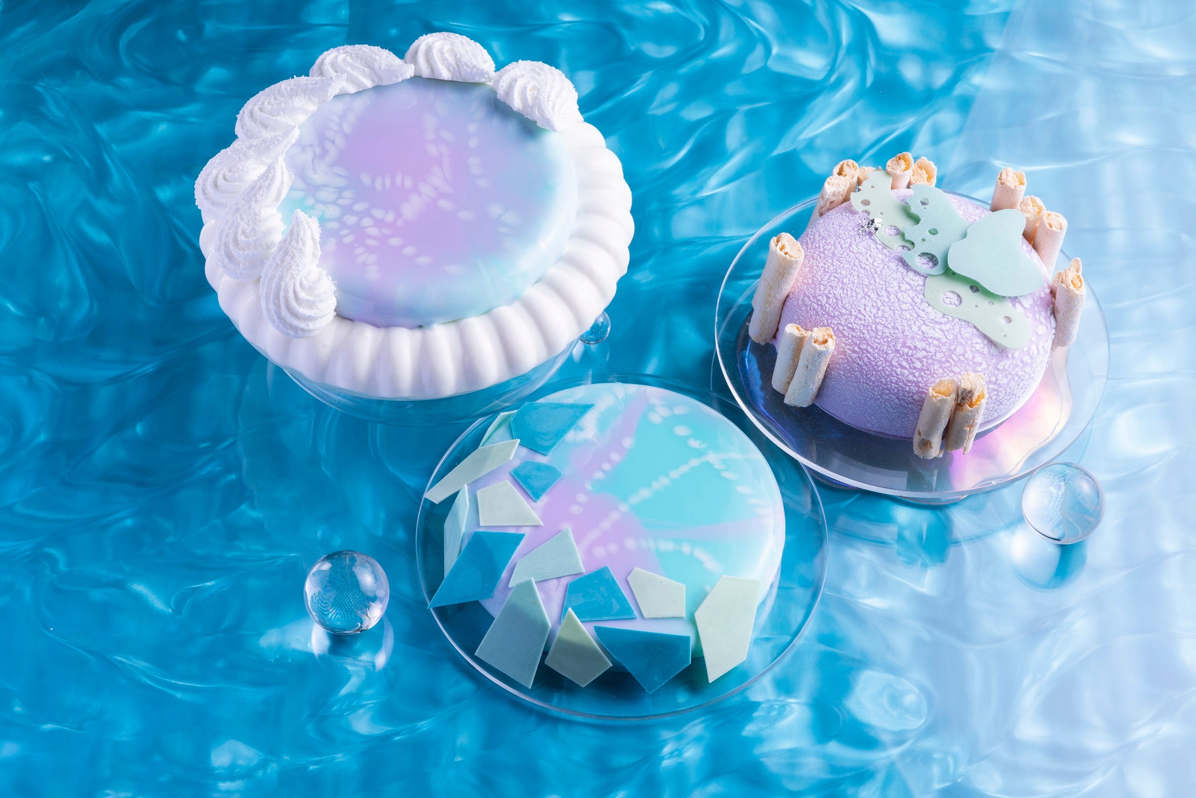 (左から)「ブルーウォーター&サンズ」「タートルネスティング・ピーチムース」「アンダー・ザ・コーラルムース」イメージ 透明感のある宮古島の海と白い砂浜をイメージした「ブルーウォーター&サンズ」は、エキゾチックムースに爽やかなフロマージュブランのムース、クミンやカルダモンが香るビスキュイを合わせた一品。ウミガメ達が立ち寄る美しいビーチを連想させる「タートルネスティング・ピーチムース」は、桃とラズベリーの果肉の食感とライチクリームのハーモニーが楽しめます
