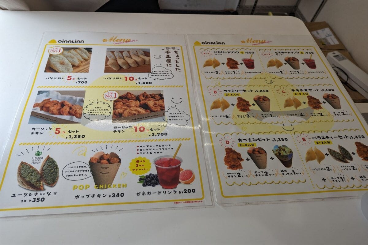 実際にどのような違いがあるのか確かめるため、沖縄県石垣市にある、沖縄本島でも人気のいなり寿司店「オイナリアン」へ行くと、確かにメニュー表がおかしい。いなり寿司と一緒にフライドチキンを食べるのが沖縄流らしいだが、本当に合うのだろうか?