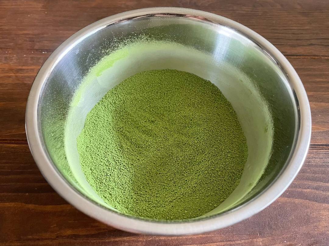 抹茶とグラニュー糖は事前にしっかり混ぜます。写真のように抹茶の粉ダマが無く、グラニュー糖に均一に分散した状態がベストです。抹茶の粉ダマは液体と合わせても潰れにくく、あとでリカバリーしようとしても難しいので注意です。プリン液を作り始める前に準備しておけば、慌てず作業を進められます。